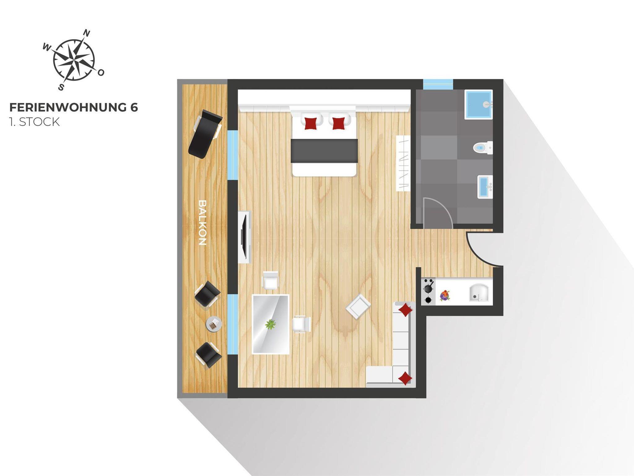 Ferienwohnung Typ 6, 30qm für 2 Personen, Wohn/Schlafraum (Doppelbett), Kochnische, Dusche/WC, SAT-TV, Safe, W-LAN, Radio und Balkon.