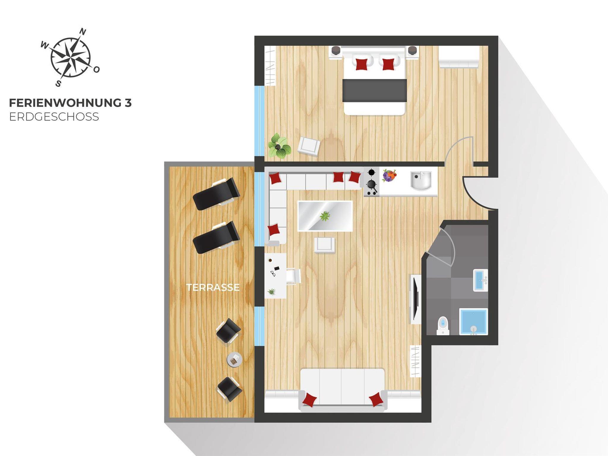 Ferienwohnung Typ 3, 42qm für 2 Personen, Wohnraum mit Sofa, sep. Schlafzimmer (Doppelbett), Kochzeile, Dusche/WC, SAT-TV, Safe, W-LAN, Radio und Terrasse.