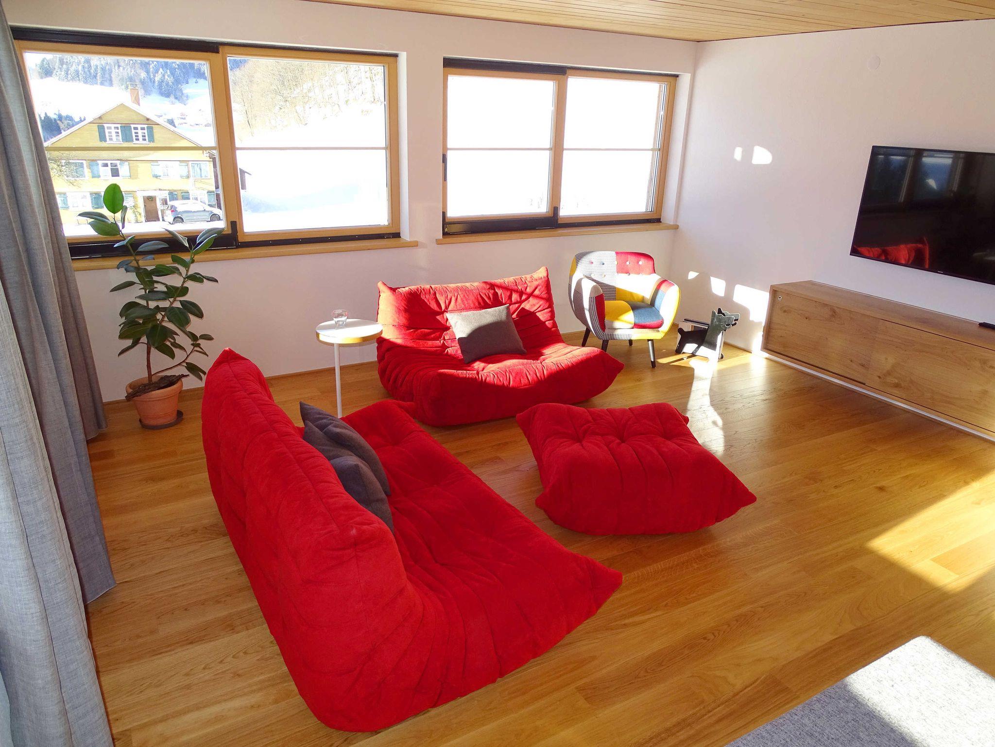 Die helle und geräumige Wohnung verfügt über einen Panoramablick auf die Winterstaude und den Rotenberg. Traditionelle Architektur mit Naturholz sorgen für Ihr Wohlbefinden.
