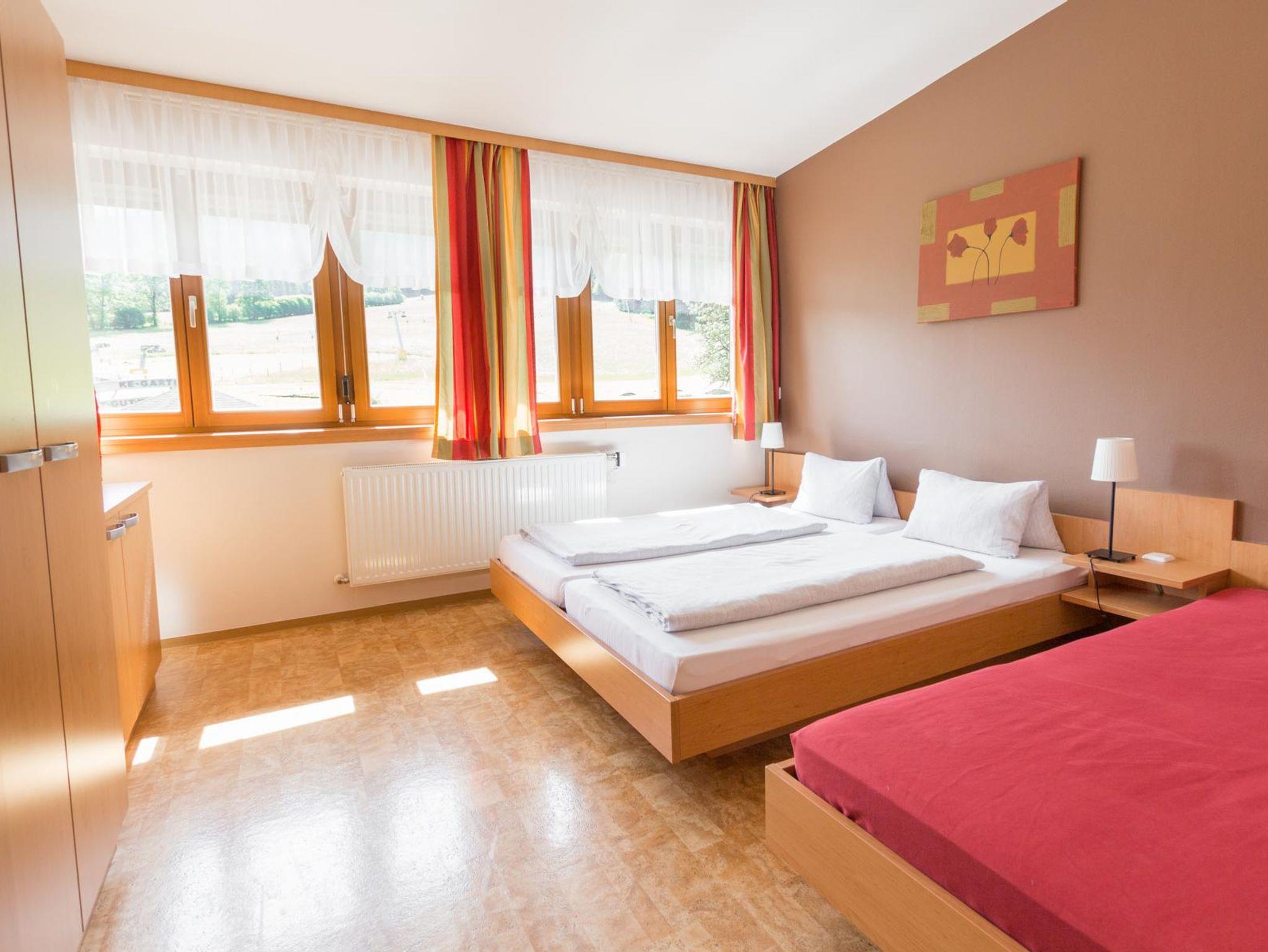 Familienzimmer mit 1 Doppelbett und 3 Einzelbetten, kombinierter Wohn- und Schlafraum mit Durchgang, 30 m2, Blick ins Grüne oder zur Skipiste, Fernseher, Schreibtisch, Sitzgelegenheit, geräumiges Bad mit Dusche und WC, gratis W-LAN