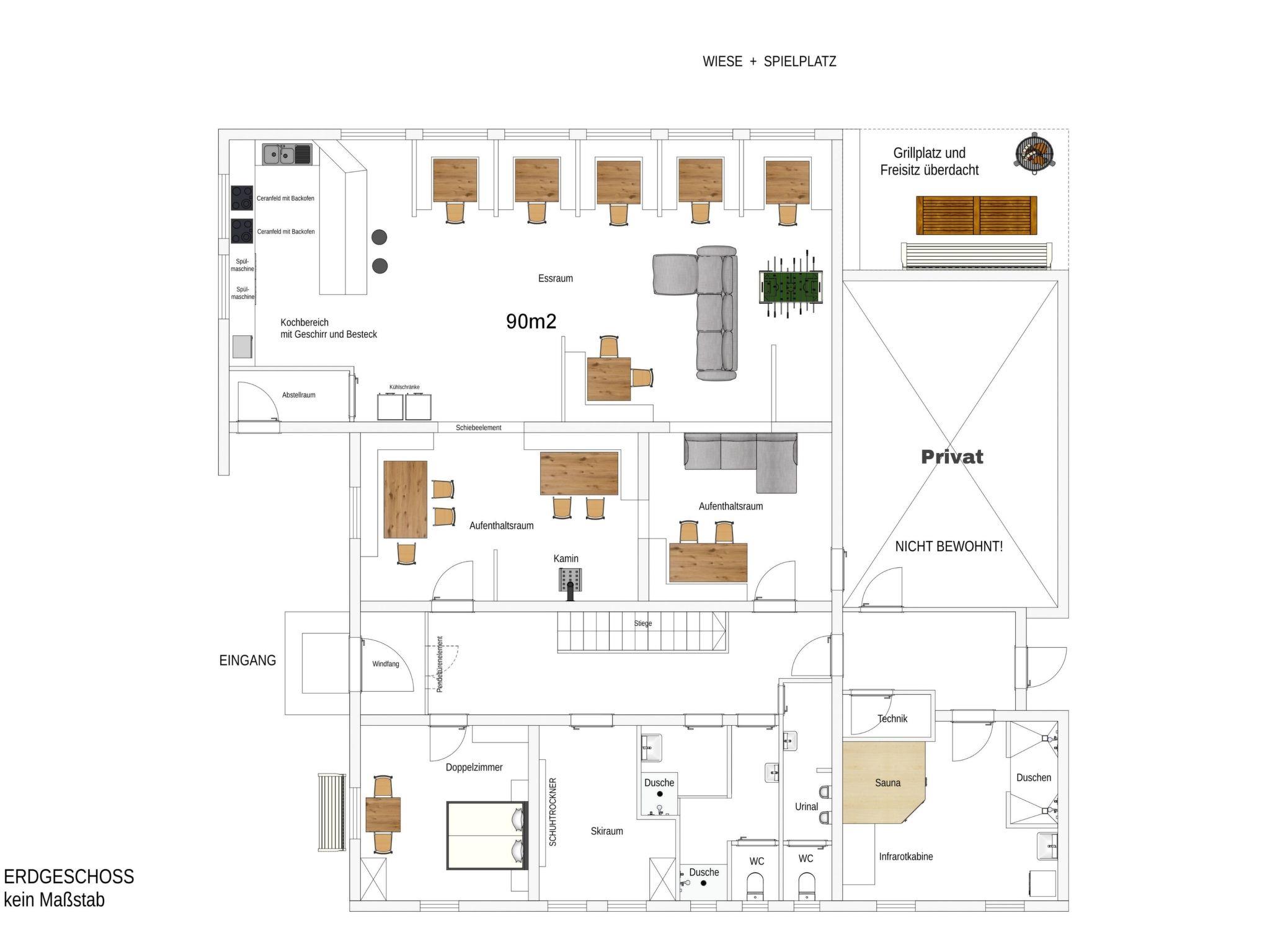 Meadow, covered barbecue area. Sandpit, football goals, swing etc.