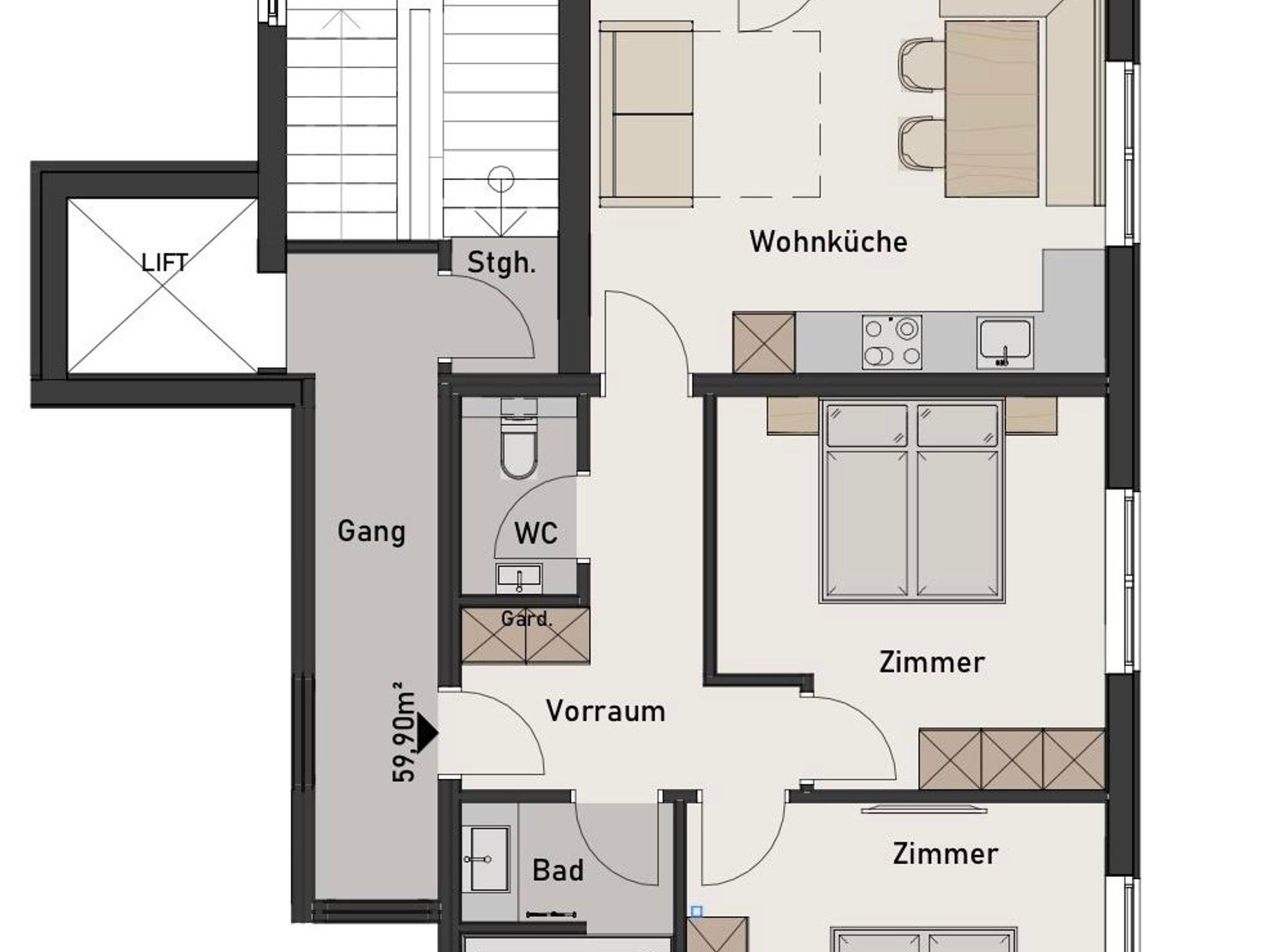 Apartment 3, 4 und 5 sind mit einem Personenaufzug im 2. Obergeschoss zu erreichen.
