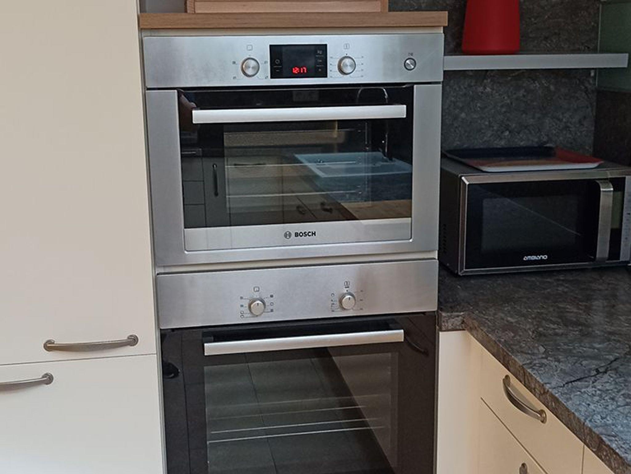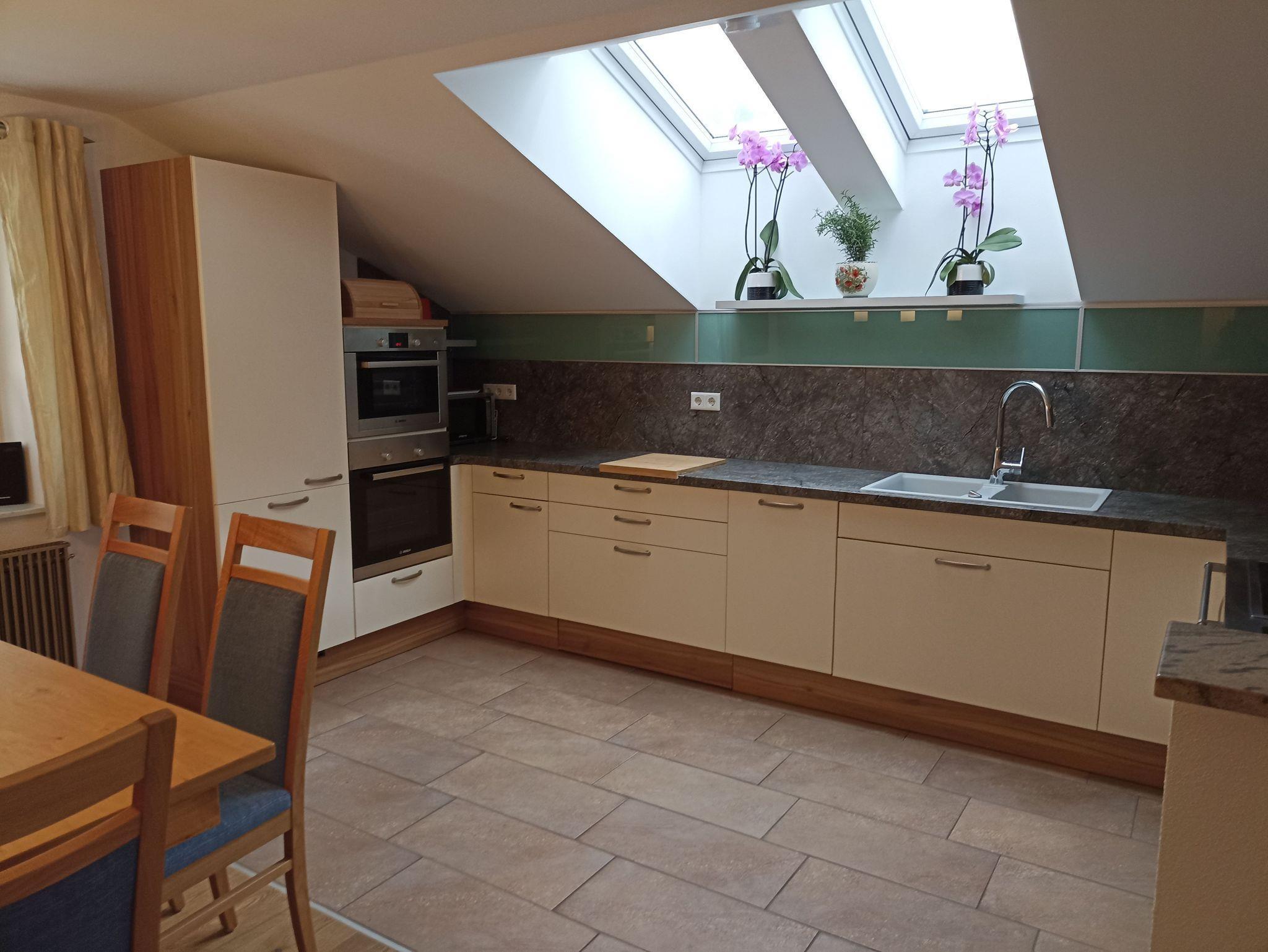 Küche mit Esstisch, Backofen, Dampfgarer, Espressomaschine, Toaster, Wasserkocher, Kühlschrank mit Tiefkühlfach, Speise und Koch Geschirr, Gläser & Besteck!
