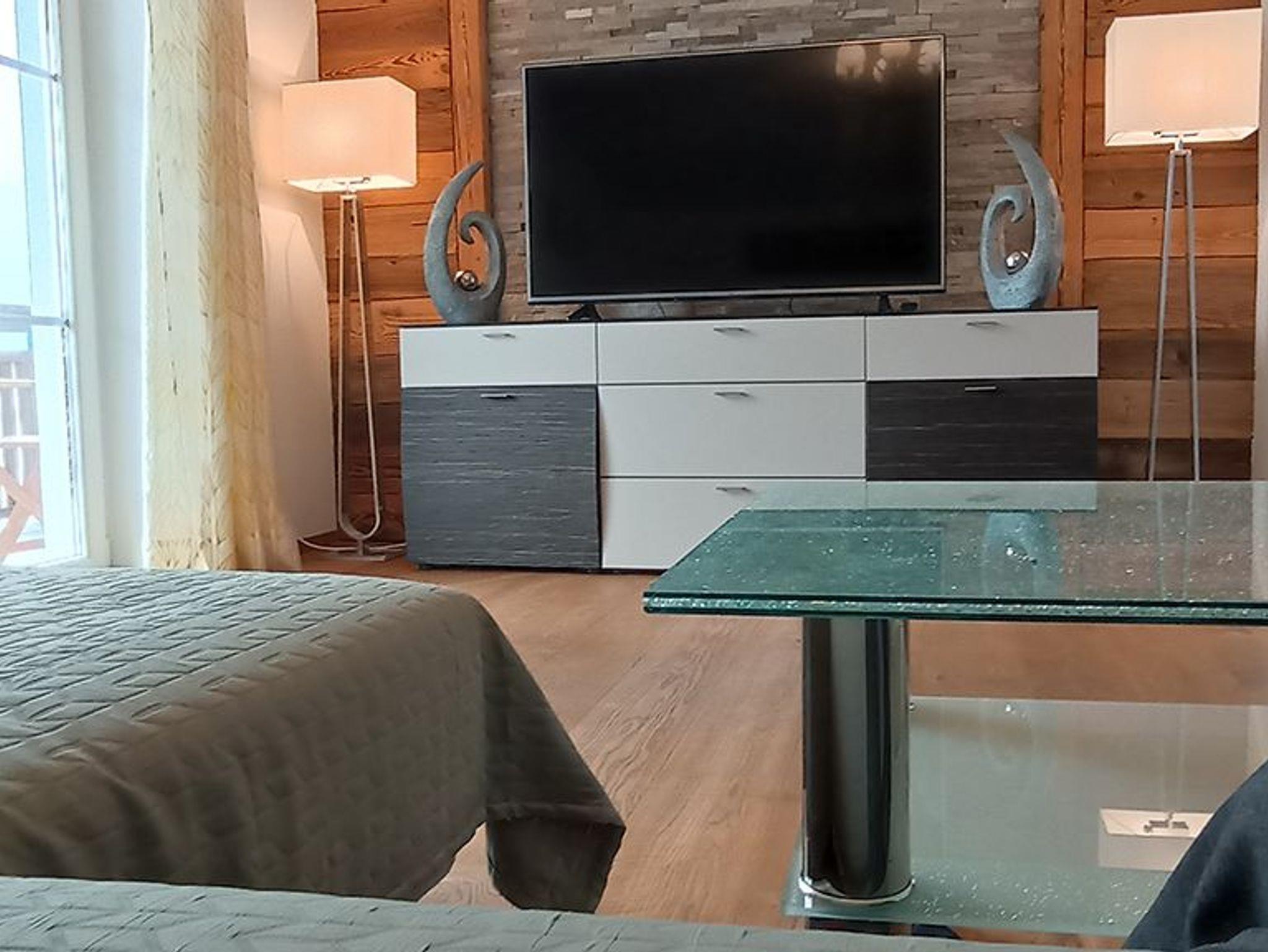 Die großzügige Ferienwohnung mit ca. 100m2 besticht durch eine tolle Raumaufteilung mit 2 Schlafzimmern für jeweils 2 Personen mit SAT TV und Blick auf See und Berge, 1 Wohnzimmer mit SAT TV und Couch, große voll Ausgestattete
