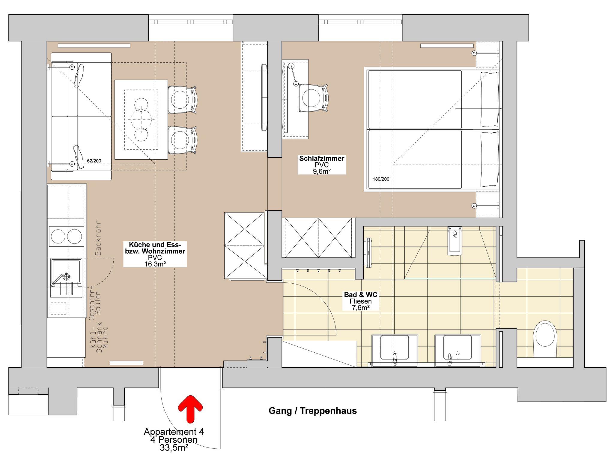 The holiday flat on the second floor covers an area of approx. 34m² and is optimally equipped for up to four people. The separate bedroom has a cosy double bed, while the combined living room and bedroom is furnished with a practical sofa bed. The fully equipped kitchen includes a dishwasher, ceramic hob, oven, microwave, fridge with freezer compartment, filter coffee machine and kettle. There is also a safe and satellite TV. The modern bathroom has a double washbasin, shower, towel dryer, hairdryer and a separate WC.