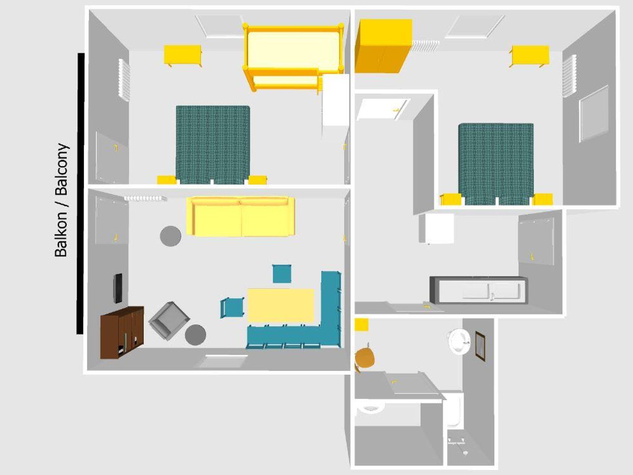 Apartment B befindet sich im 1. Stock und bietet Platz für 6 Personen. Das Apartment verfügt über ein Wohnzimmer mit einem Balkon, einen österreichischen Essbereich und ein Doppelschlafsofa. Die Wohnung verfügt über zwei Schlafzimmer, ein Schlafzimmer mit Balkon und ein Doppelbett und ein Schlafzimmer mit einem Doppelbett und einem Etagenbett. Die Wohnung verfügt über ein geräumiges Badezimmer mit Toilette und eine voll ausgestattete Küche.