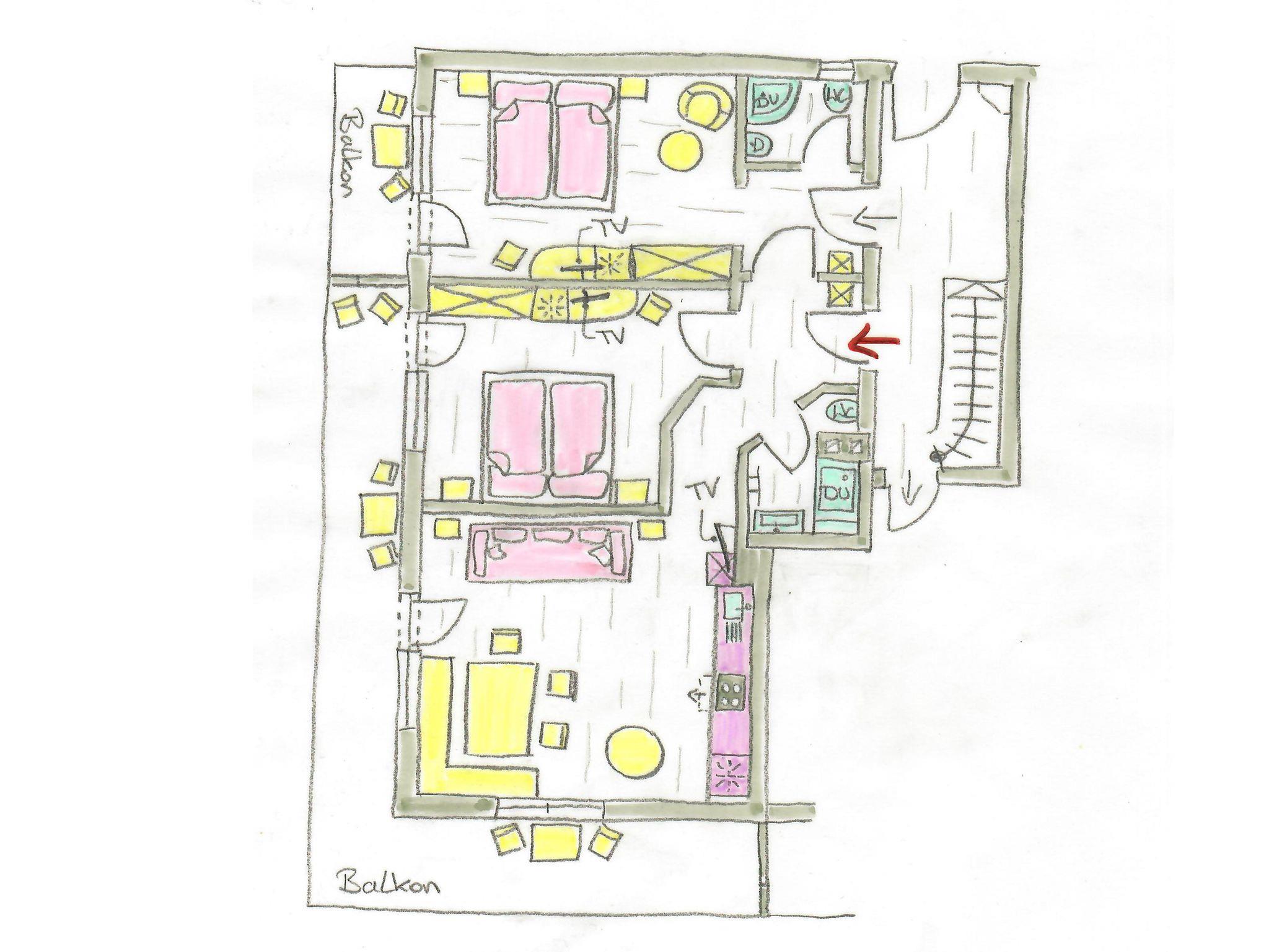 Ferienwohnung mit 80m² für 4-6 Personen , 2 getrennte Schlafzimmer , Wohnküche mit Couch und SatTv, 2 x Dusche /Wc , Balkon bei allen Zimmern.