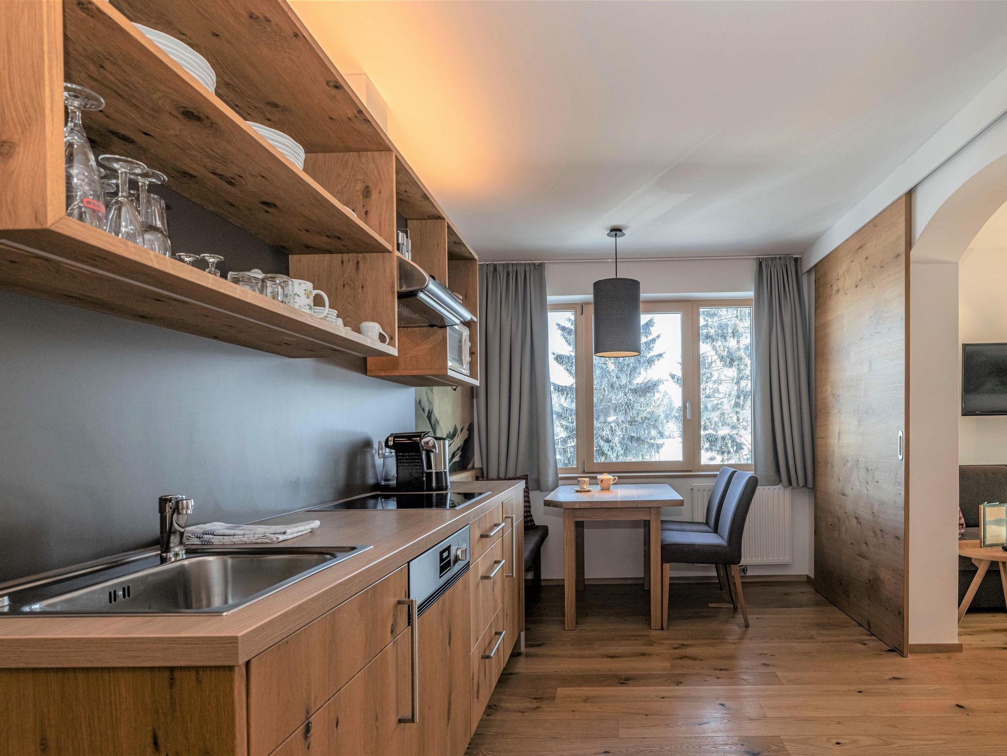 Küche mit gemütlicher Sitzgelegenheit, Mikrowelle, Inductionsherdplatte, Geschirrspüler, automatische Kaffeemaschine mit 6 Stk. Kapseln (weitere Kapseln sind gegen Aufpreis bei uns an der Rezeption erhältlich), Wasserkocher, genügend Geschirr, Besteck, Geschirrtücher, Salz/Pfeffer, Zucker.