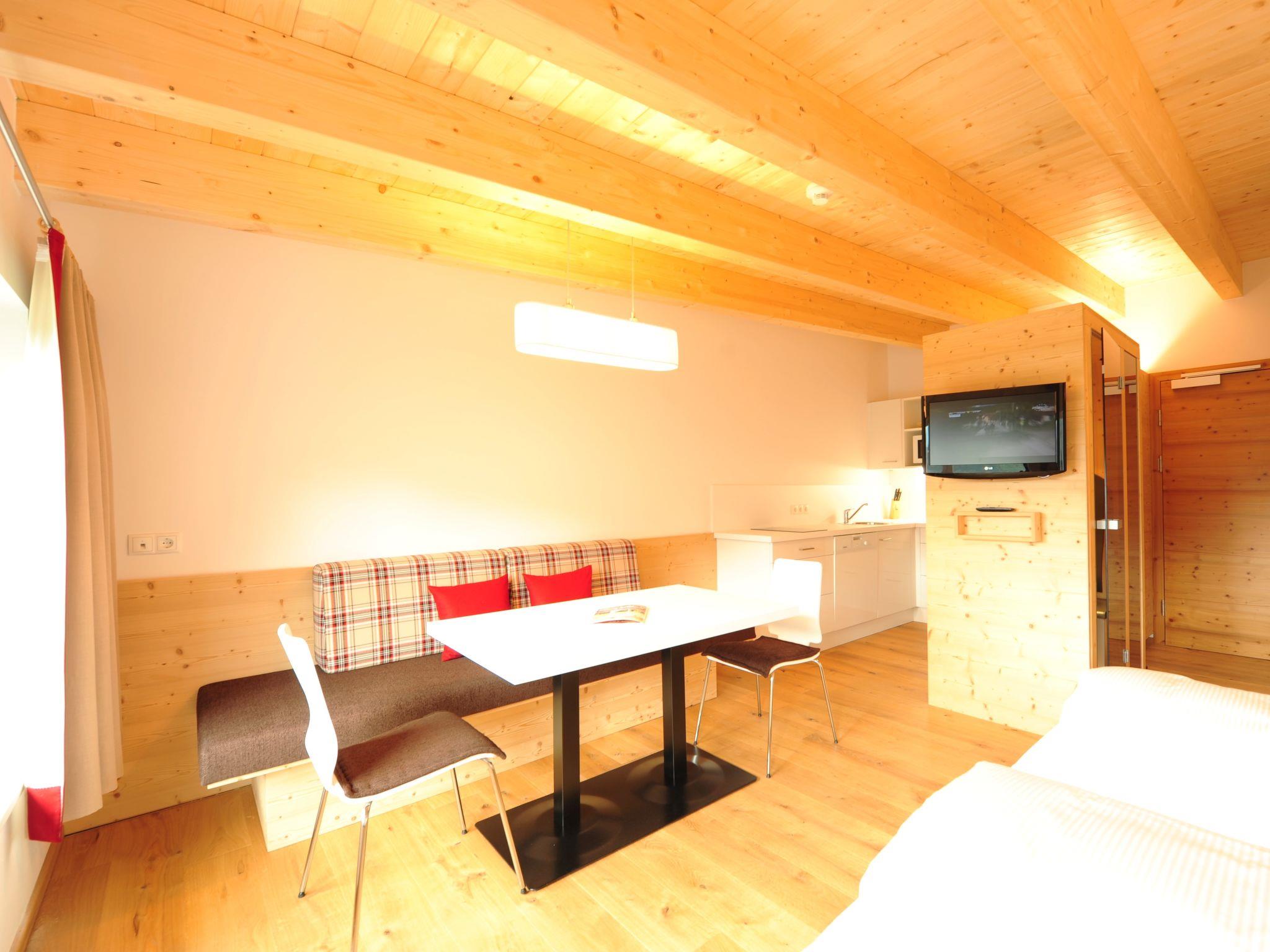 "Alpelux-Talseite", 1-room studio 30 m2, on the top floor. Spacious, comfortable and modern furnishings: living/sleeping room with 1 double bed, dining nook and satellite TV (flat screen). Kitchenette (dishwasher, 2 ceramic glass hob hotplates, toaster, kettle, microwave, electric coffee machine). Bath or shower/WC. Heating. Parquet floors. Very beautiful panoramic view of the mountains. Facilities: Internet (WiFi, free). Parking at 20 m. Please note: non-smokers only. Smoke alarm.