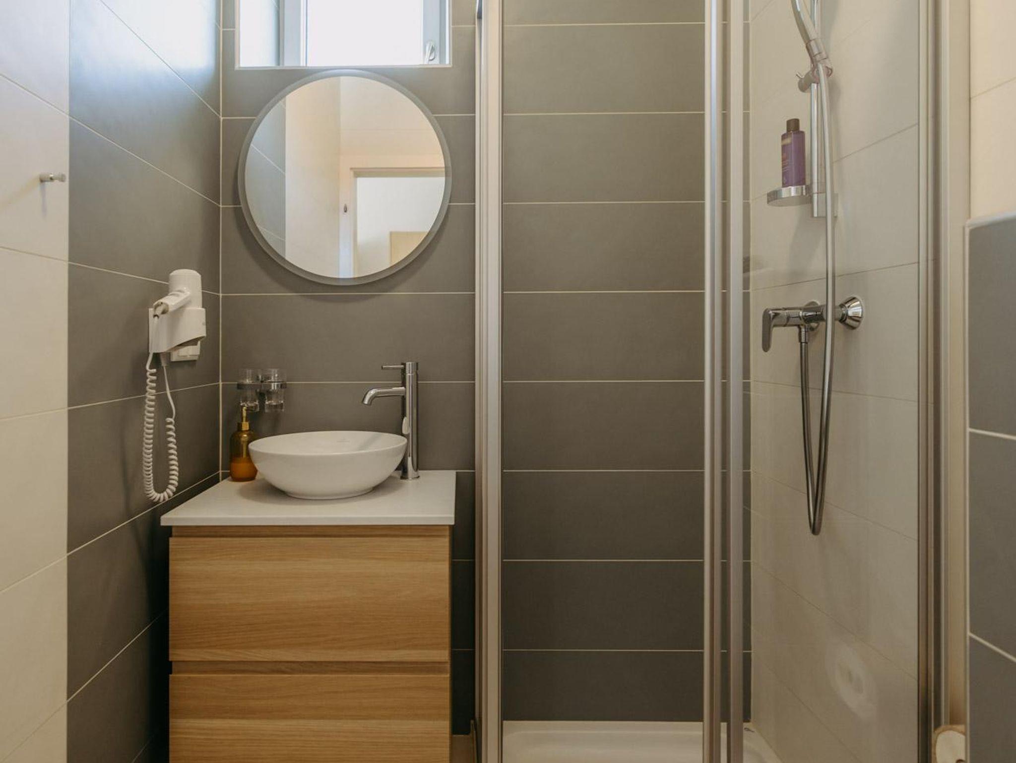 Das Badezimmer verfügt über einen Haarföhn, einem beheizbaren Spiegel mit LED Beleuchtung, genügend Stauraum für Ihre Waschutensilien, einer modernen Dusche und WC.