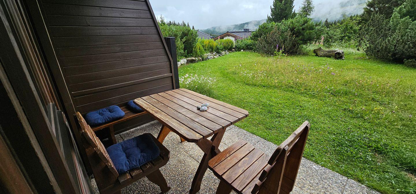 1x Doppelstockbett aus Massivholz hier haben bis zu 4 Personen platz, Essecke, gemütliche Sofaecke, TV; Terrasse südseitig; 1 komplett ausgestattete Küchenzeile mit Kaffeemaschine, Geschirrspüler, Mikrowelle, Kühlschrank und 4-Platten-Ceranfeld (KEIN Backofen); 1 Badezimmer mit Dusche und WC; Mit Fußbodenheizung in Küche und Bad. 1 Sitzbank und 2 Stühle und ein Tisch sind auf der Terrasse Sommer wie Winter zur Verfügung. Parkplätze am Gebäude.