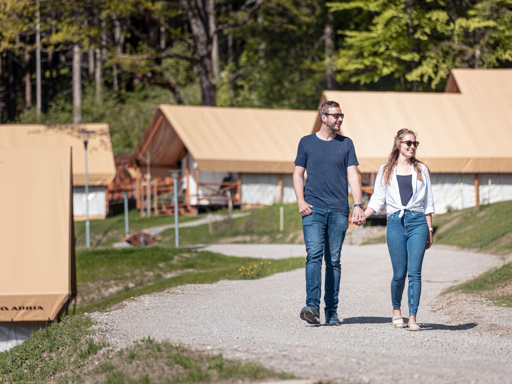 Kötschach-Mauten: Car free modern resort "Chalets/Glamping Nassfeld by AlpsR.", 700 m a.s.l.. 500 m from the centre, in a sunny position on a slope, directly by the skiing area. For shared use: children's playground. In the complex: reception, kiosk. Parking. E-charging station. Supermarket 850 m. Golf course (18 hole) 20 km, skisport facilities, ski rental 200 m. Well-known ski regions can easily be reached: Nassfeld 25 km. Well-known lakes can easily be reached: Pressegger See. Hiking paths: Nassfeld-Pressegger See. The holiday properties may differ in living space, floorplan, equipment and furnishing.