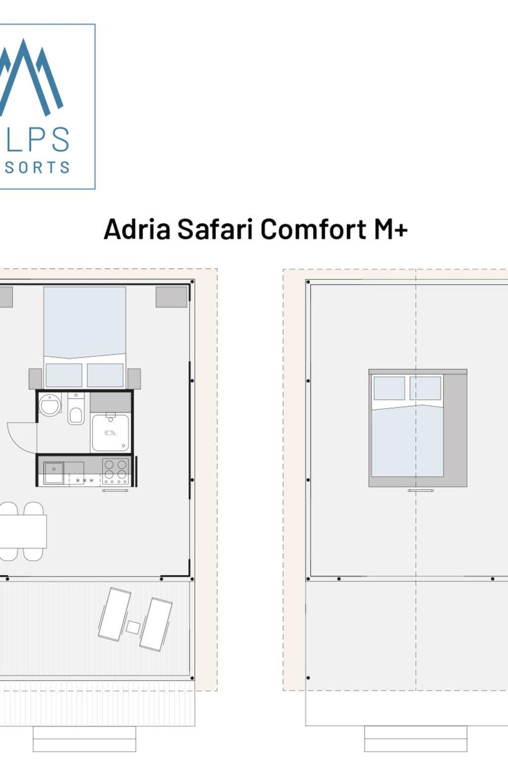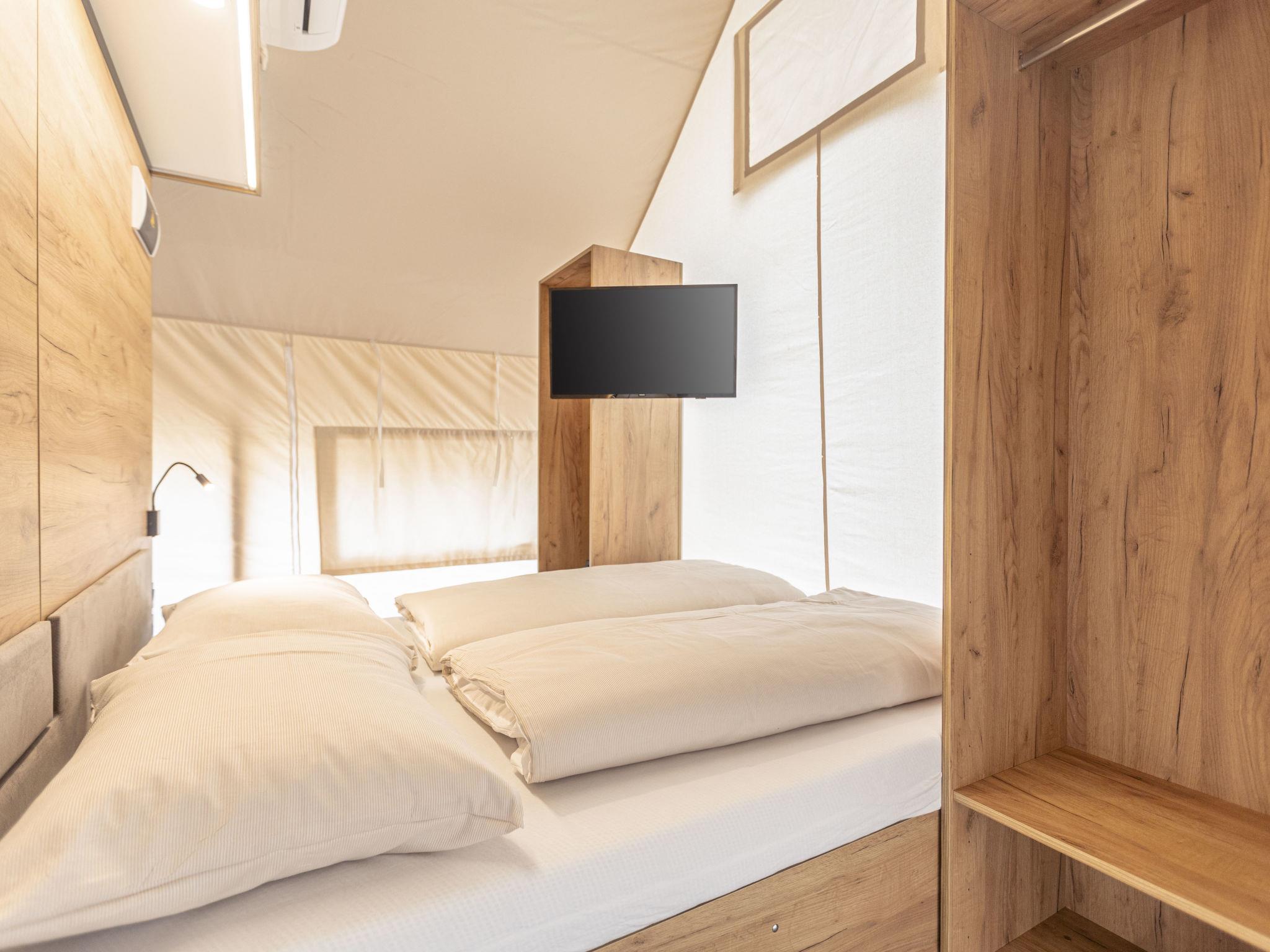"Luxuszelt Safari für 4 Personen", 2-room mobile home 31 m2 on 2 levels. Bright, cosy furnishings: living/sleeping room with 1 double sofabed, dining table, satellite TV and flat screen. Open kitchen (dishwasher, 4 ceramic glass hob hotplates, toaster, freezer, electric coffee machine). Shower/WC. No heating option. Upper floor: 1 double bedroom. Terrace. Terrace furniture. Very beautiful view of the mountains and the resort. Facilities: Internet (WiFi, free). Please note: non-smokers only. The property is one of a type of property or apartment. ATTENTION: The object is a tent! Air conditioning available, it can also be heated minimally with this!