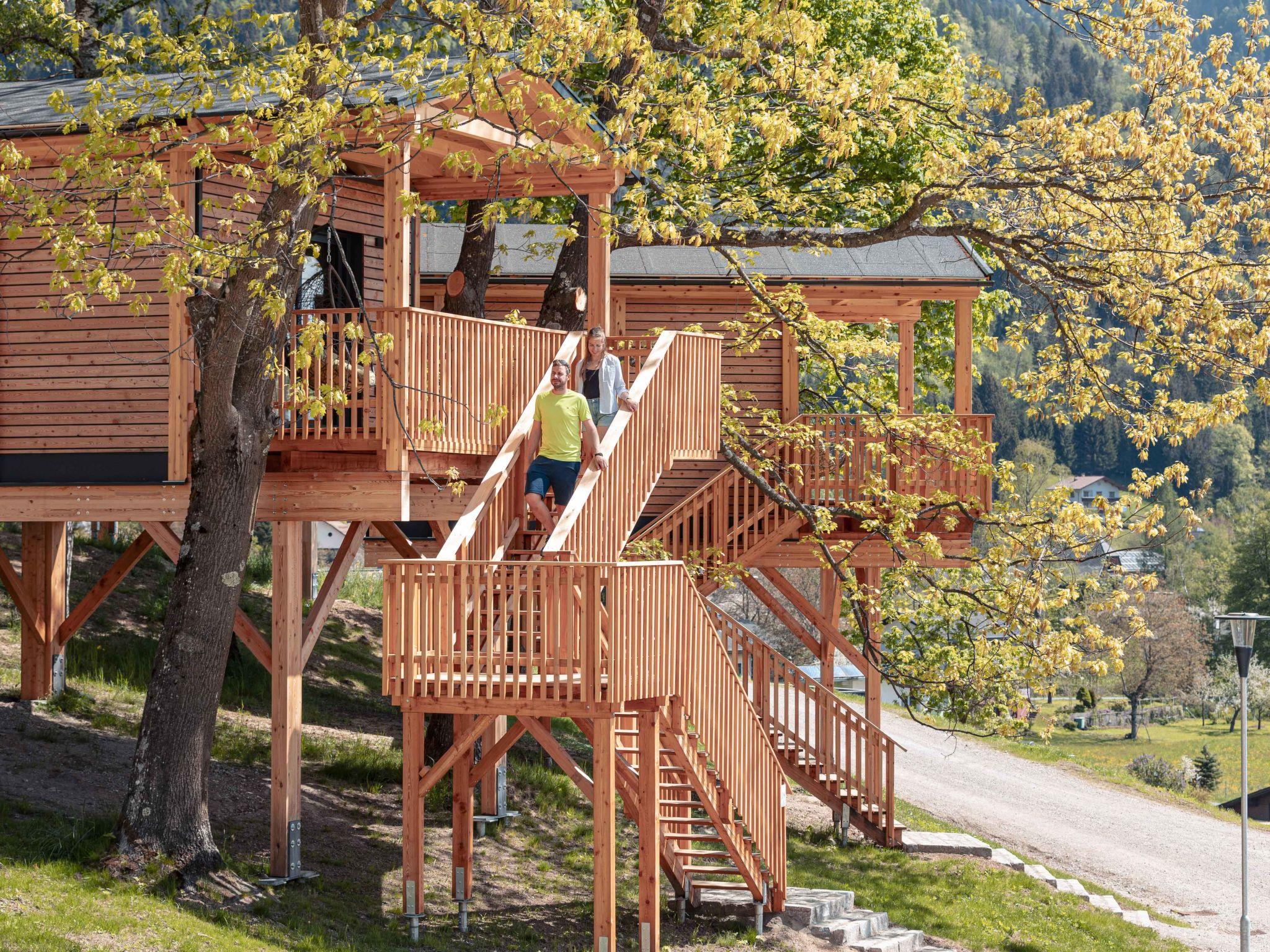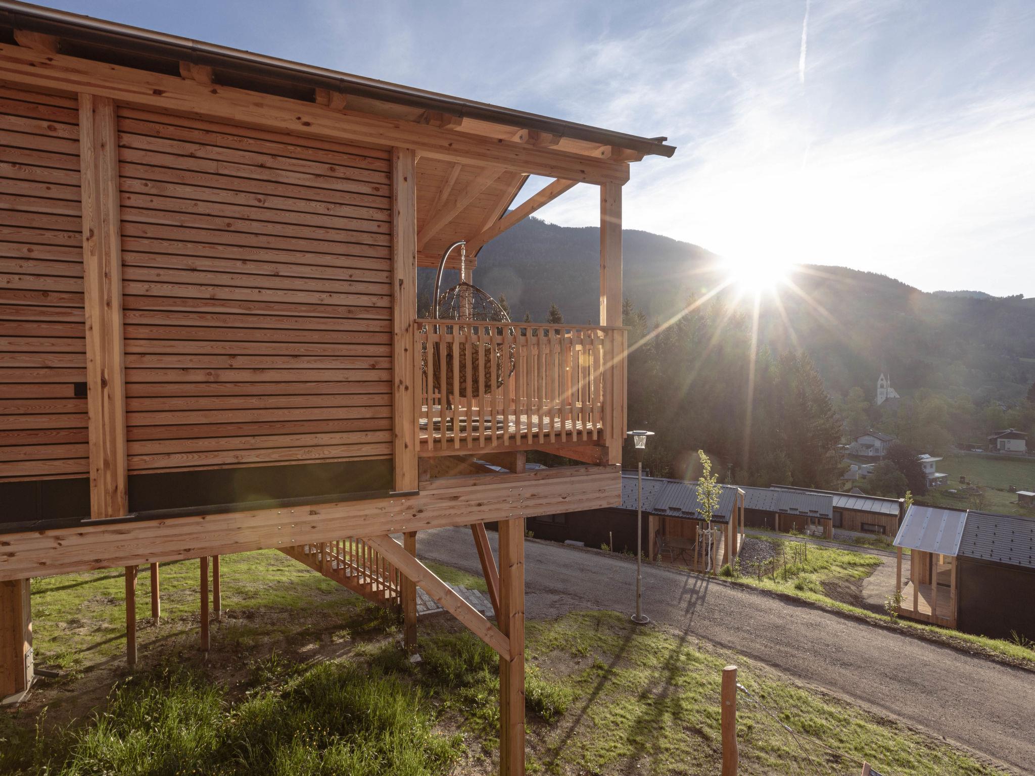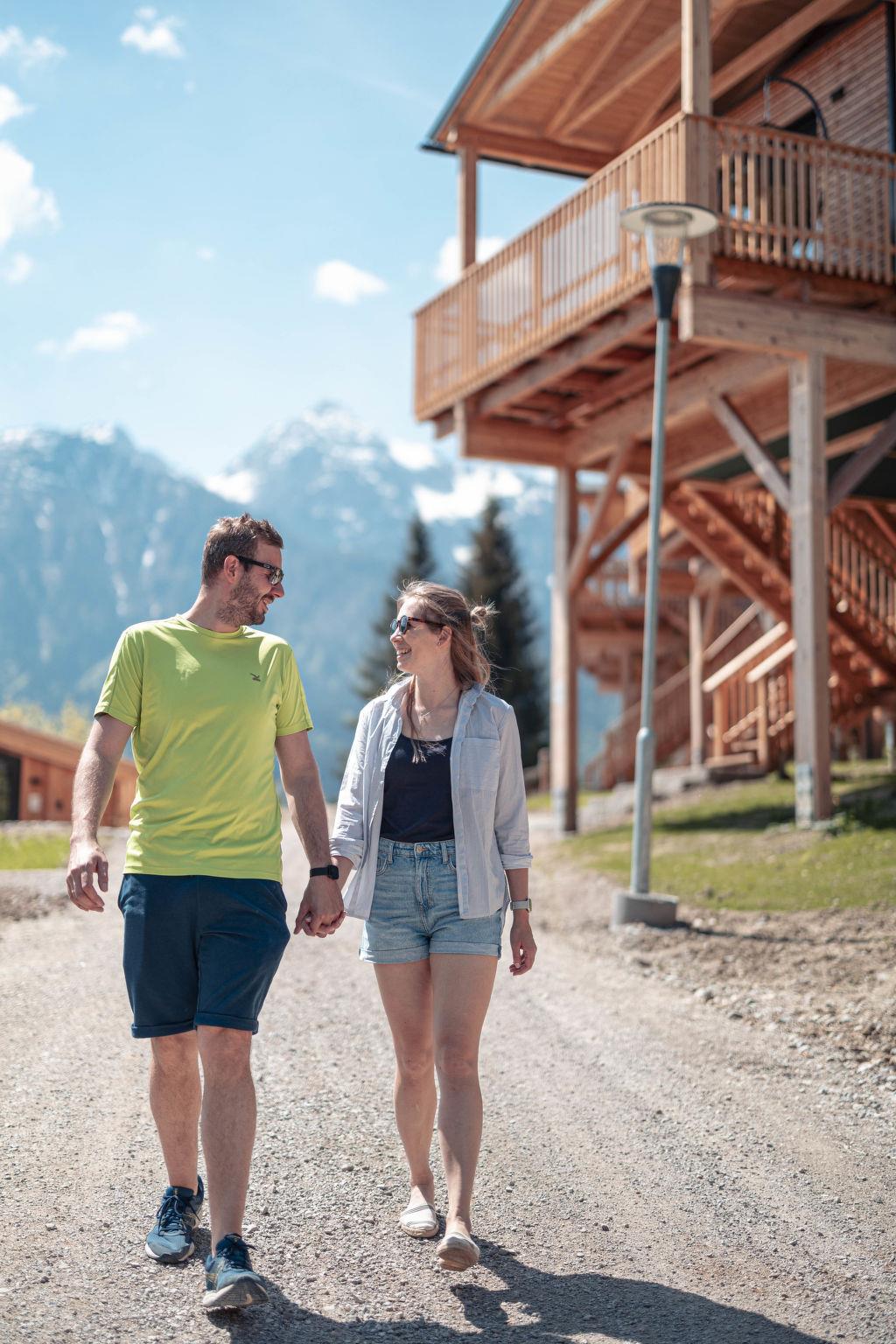 Kötschach-Mauten: Car free modern resort "Chalets/Glamping Nassfeld by AlpsR.", 700 m a.s.l.. 500 m from the centre, in a sunny position on a slope, directly by the skiing area. For shared use: children's playground. In the complex: reception, kiosk. Parking. E-charging station. Supermarket 850 m. Golf course (18 hole) 20 km, skisport facilities, ski rental 200 m. Well-known ski regions can easily be reached: Nassfeld 25 km. Well-known lakes can easily be reached: Pressegger See. Hiking paths: Nassfeld-Pressegger See. The holiday properties may differ in living space, floorplan, equipment and furnishing.