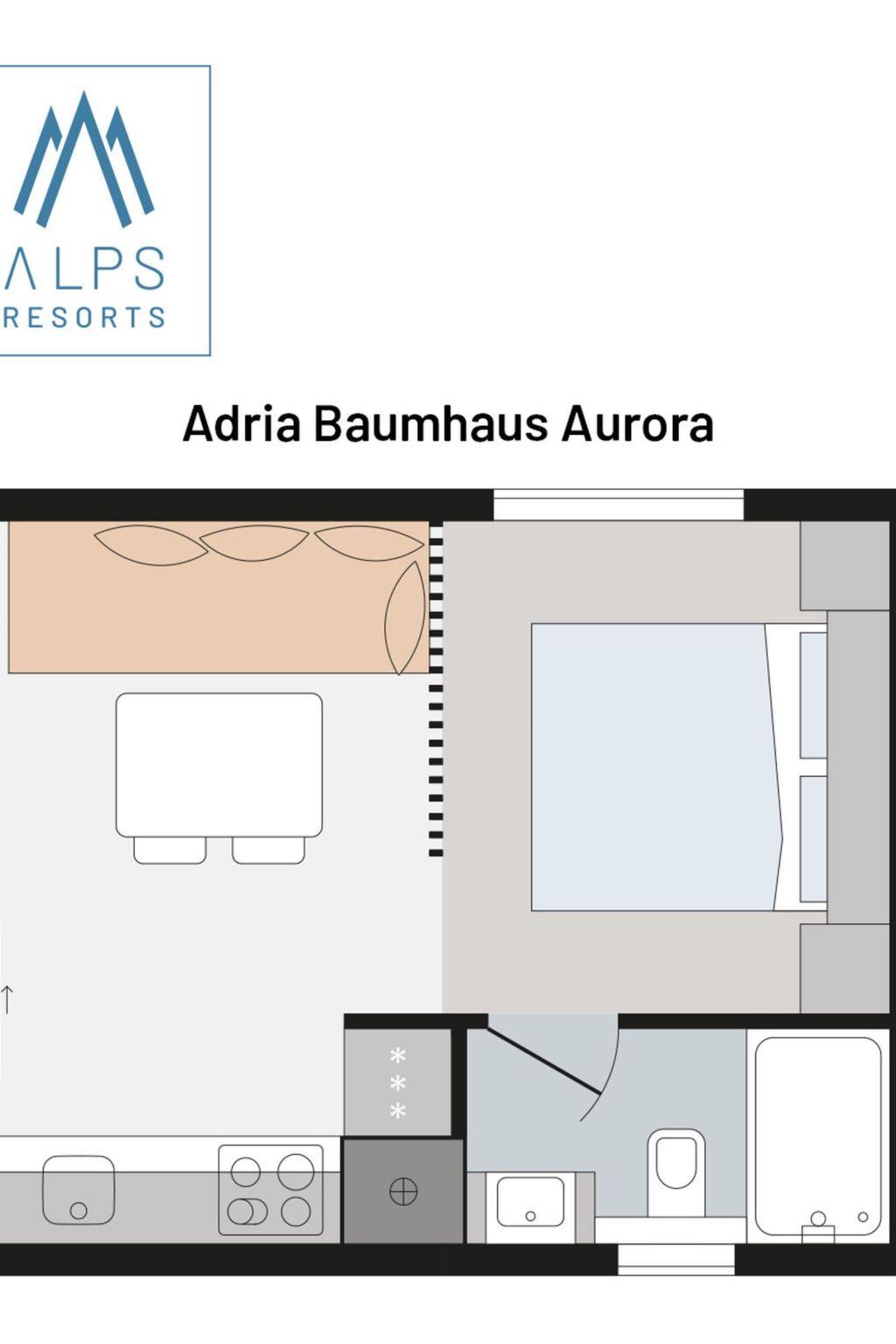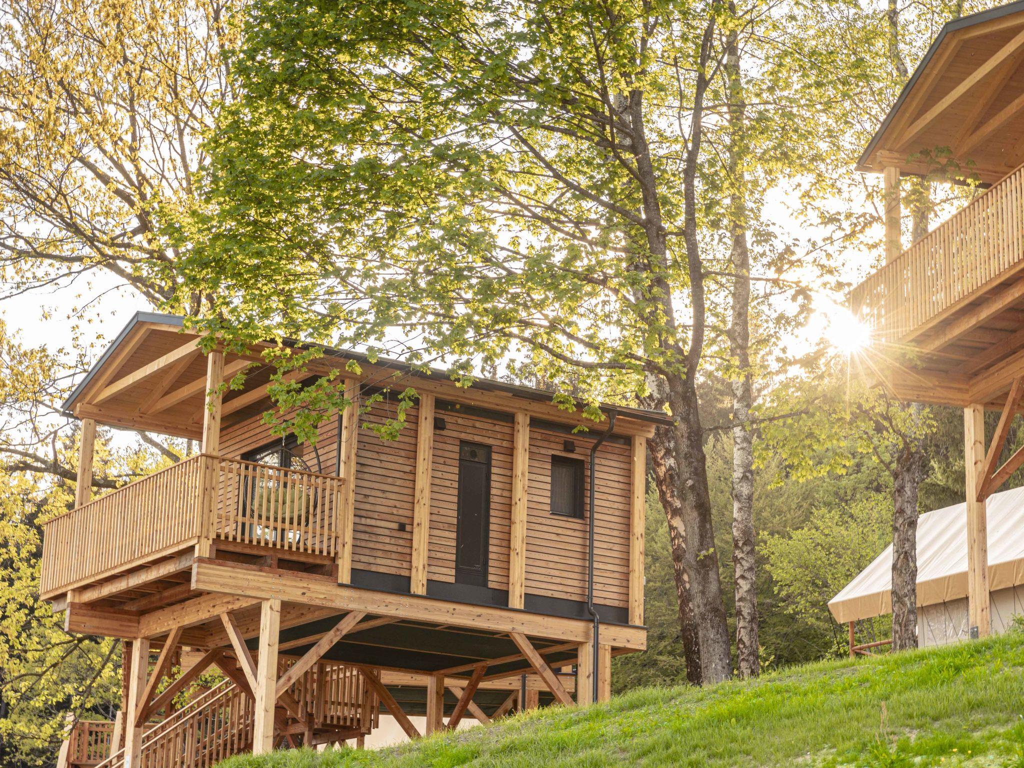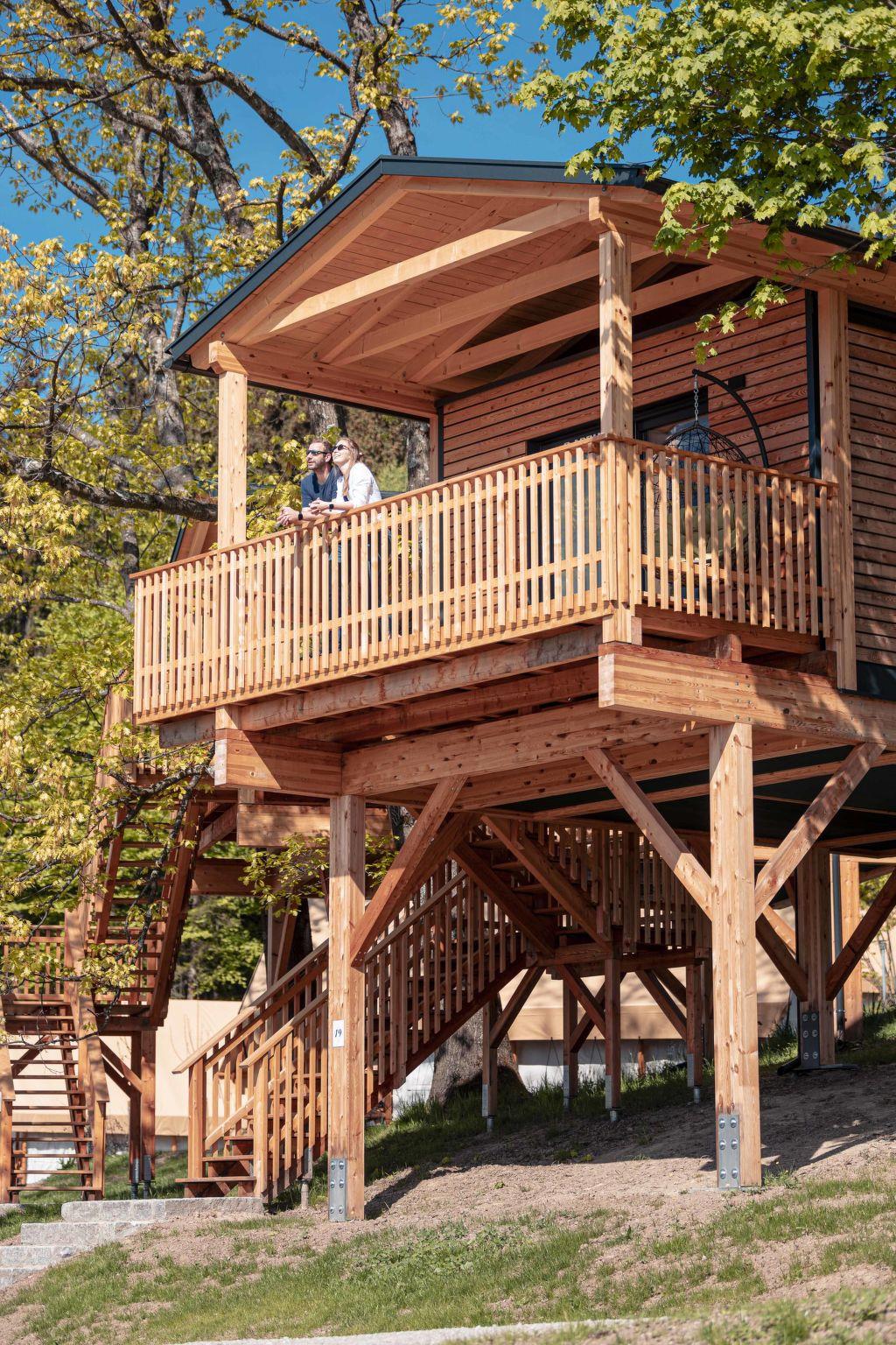 "Premium Baumhaus mit 1 Schlafzimmer", 2-room house 23 m2. Bright, tasteful and cosy furnishings: living/dining room with dining table, satellite TV and flat screen. 1 double bedroom. Open kitchen (oven, dishwasher, 4 ceramic glass hob hotplates, toaster, kettle, microwave, electric coffee machine). Shower/WC. Heating. Small terrace. Terrace furniture. Very beautiful view of the mountains and the resort. Facilities: Internet (WiFi, free). Please note: non-smokers only. The property is one of a type of property or apartment.