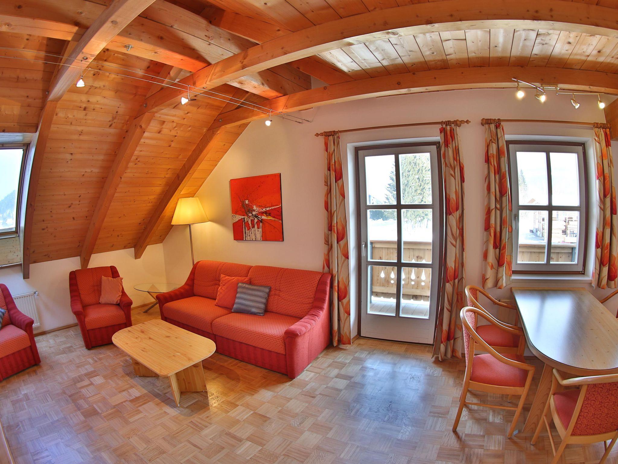 28m² große Junior Suite teilweise mit Balkon, Dusche/WC, Fön, Minibar, SAT-TV, freier Nutzung des WLAN-Netzes des Hauses, gemütlicher Sitzecke mit Blick auf die Karnischen Alpen. NICHTRAUCHER ZIMMER!