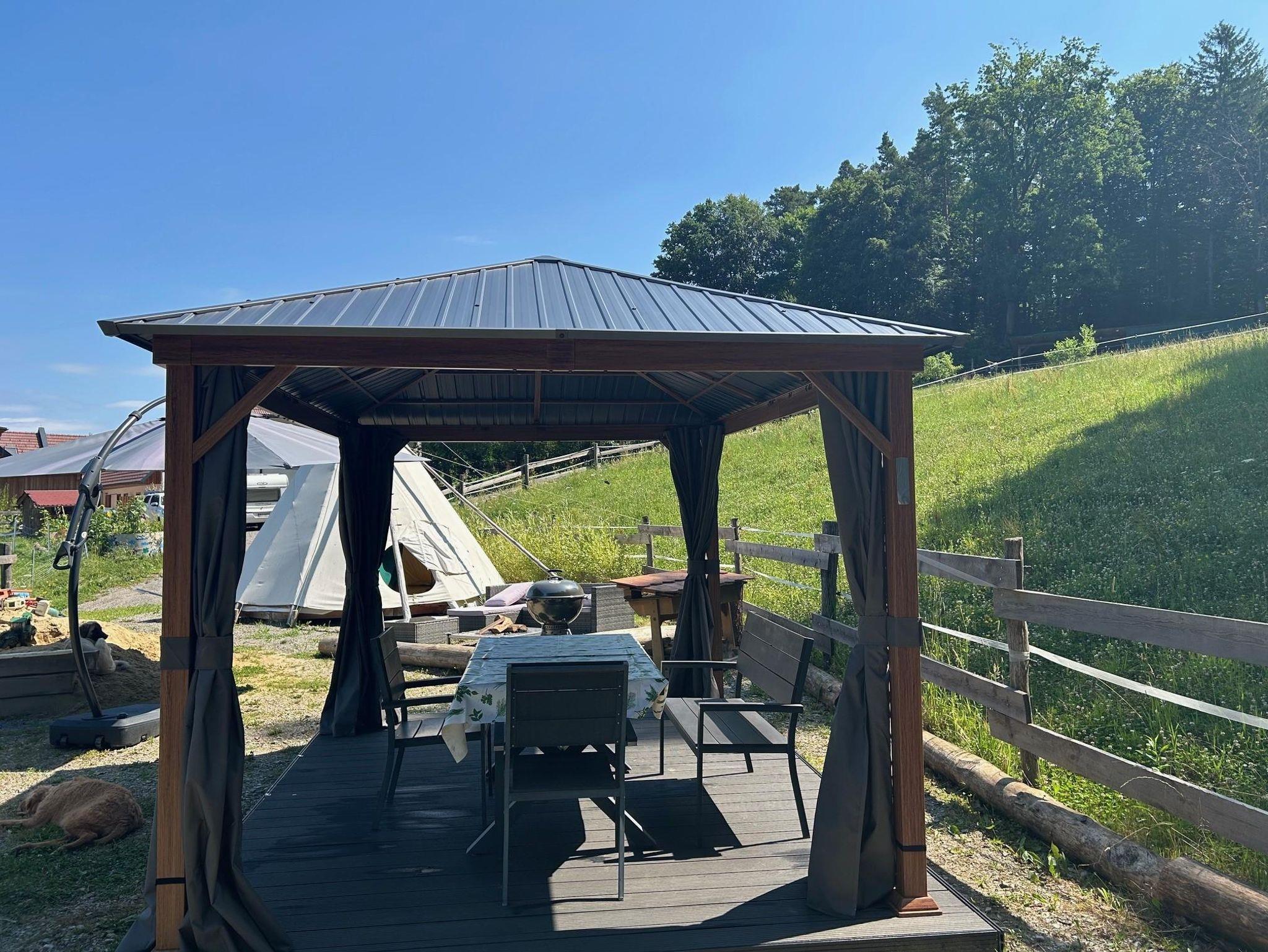 Es ist mit 20 m² Holzboden und zwei Betten (Matratzen und Leintuch) ausgestattet - auf Wunsch auch mit Strom versorgt. Kinder können sich am Spielplatz austoben oder die zahlreichen Hoftiere kennenlernen. Ein knisterndes Lagerfeuer an der Feuerstelle rundet das Camping-Erlebnis ab.