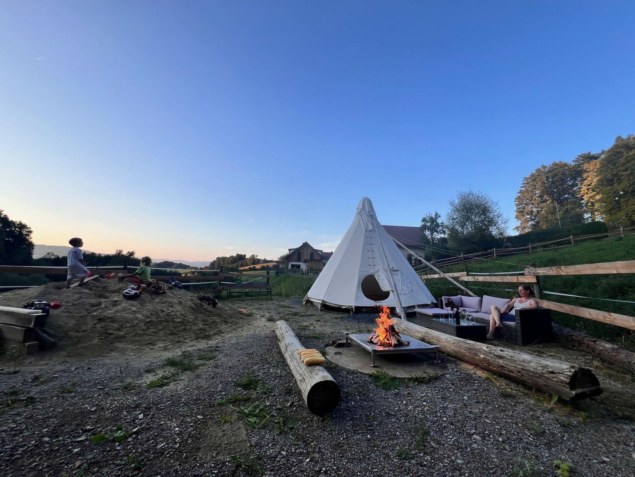Das TIPI ist mit 20 m² Holzboden ausgestattet und auf Wunsch auch mit Strom versorgt. Kinder können sich am angrenzenden Spielplatz austoben oder die zahlreichen Hoftiere kennenlernen. Ein knisterndes Lagerfeuer an der Feuerstelle rundet das Camping-Erlebnis ab.