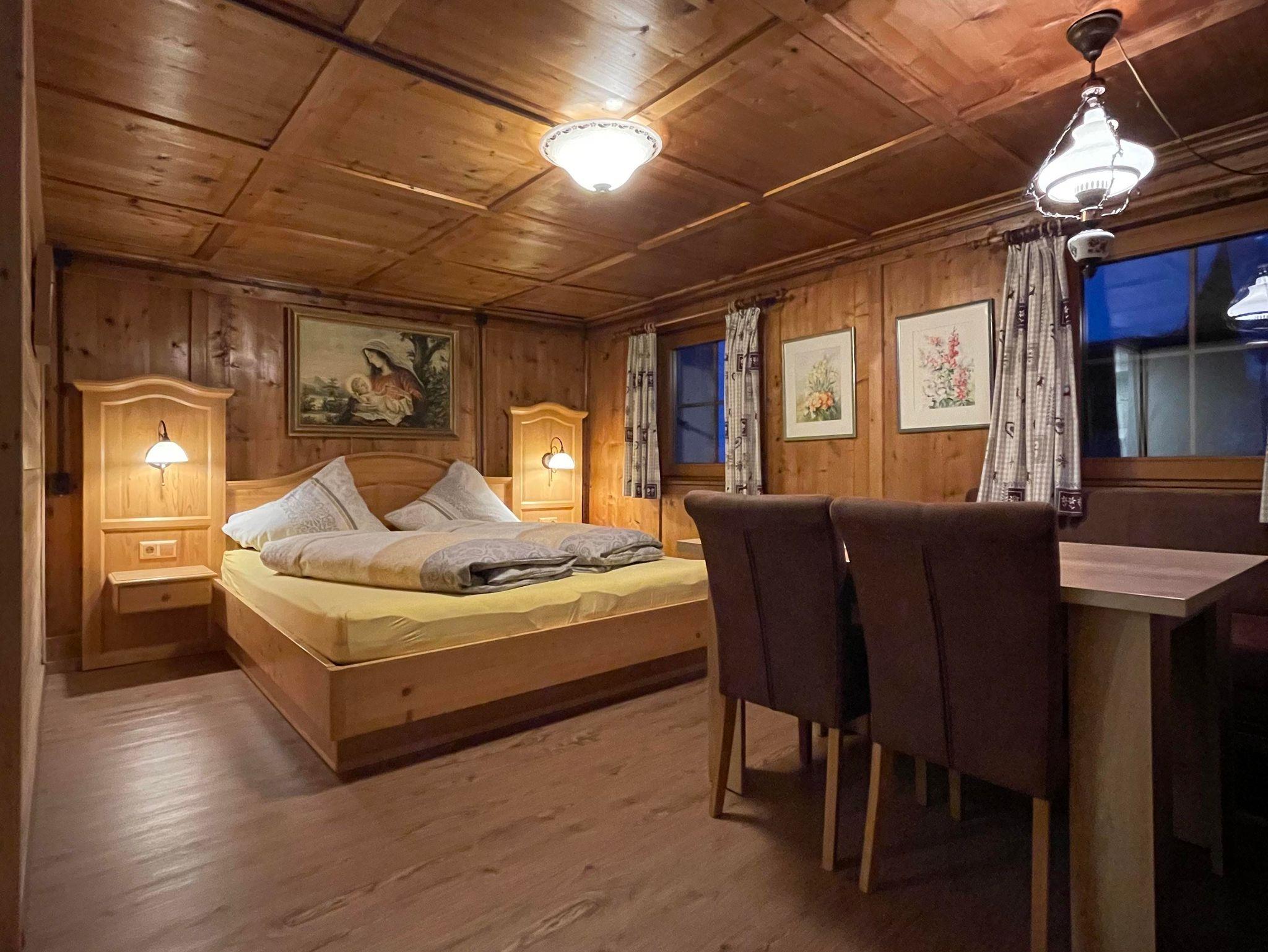 Großes Doppelbettzimmer im Altholzstil. Geräumiges Badezimmer. Blick Richtung Süden.
