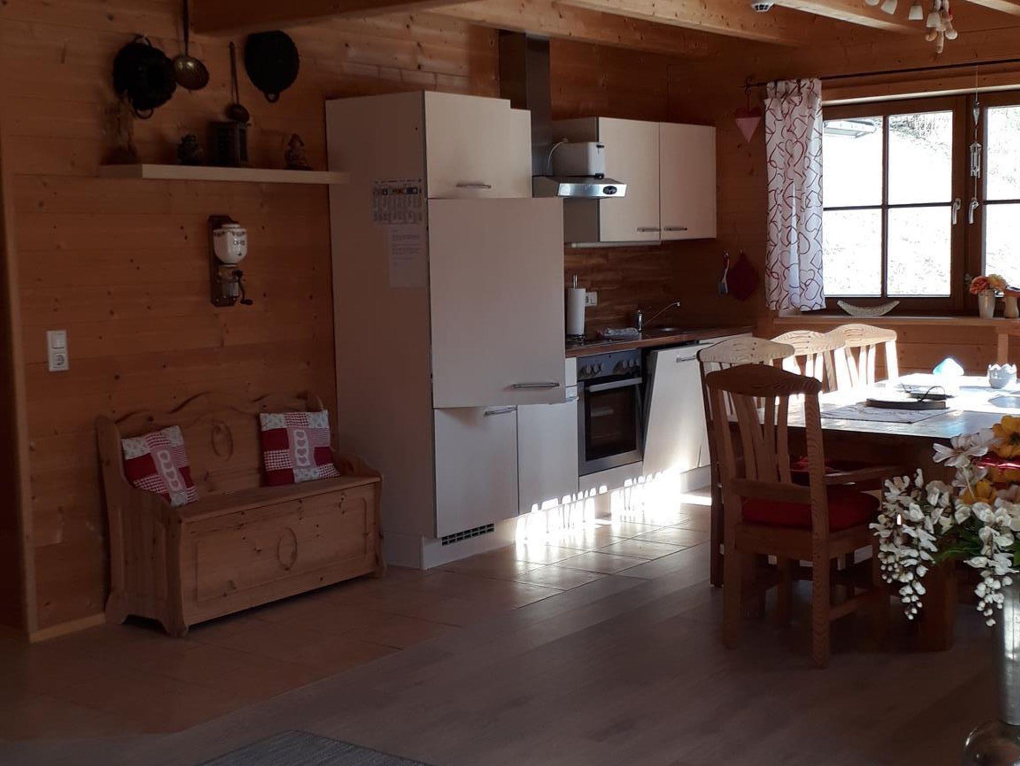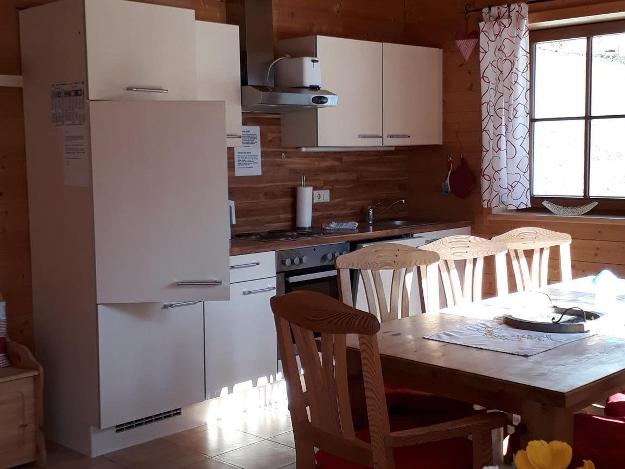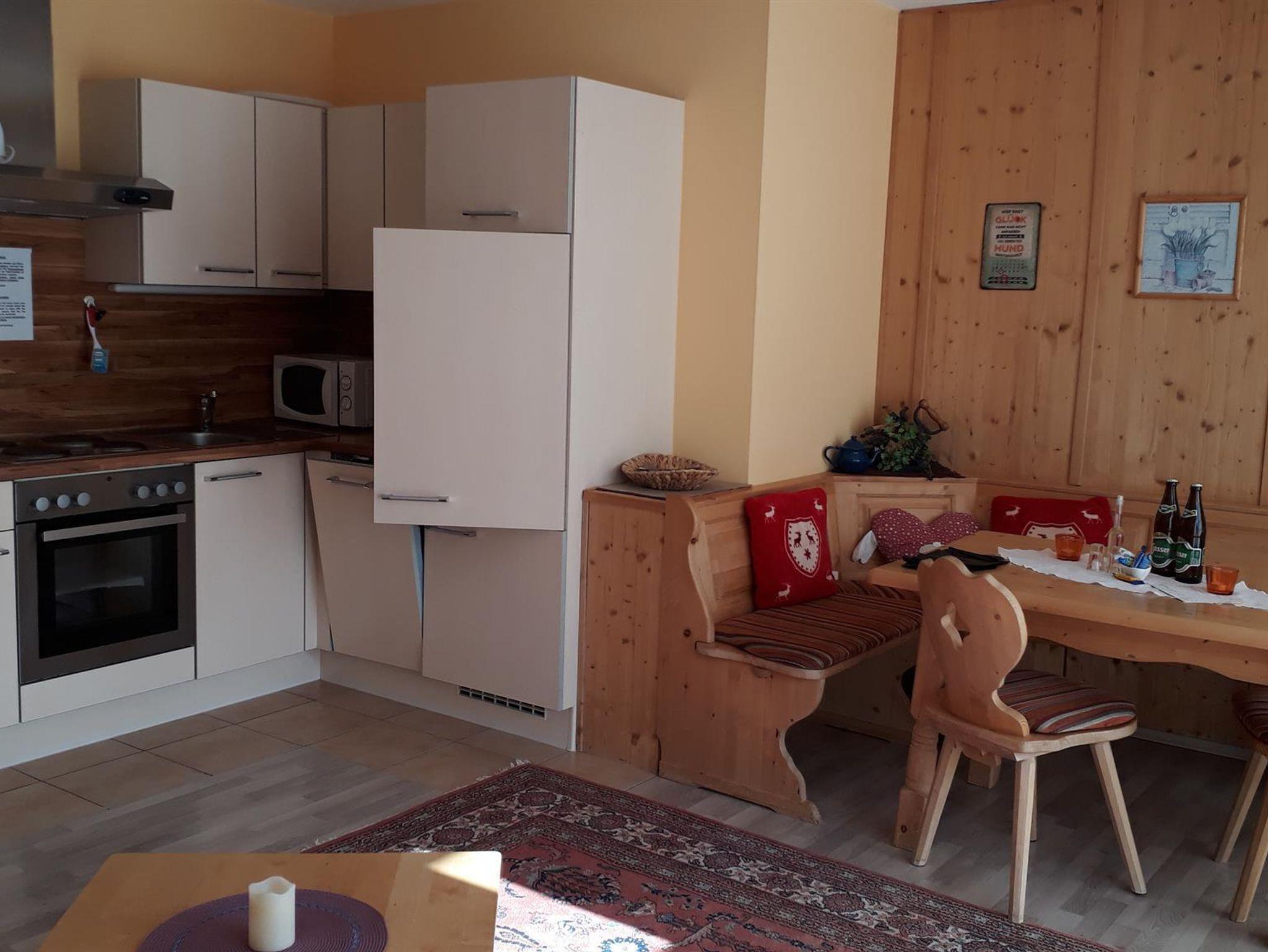 Gemütliche Erdgeschoßwohnung mit Terrasse und Blick über Kals. Voll eingerichtete Einbauküche im Wohn/Essbereich, Sitzecke und Schlafsofa. Duschbad mit WC sowie Schlafzimmer mit Doppelbett und großem Kleiderschrank