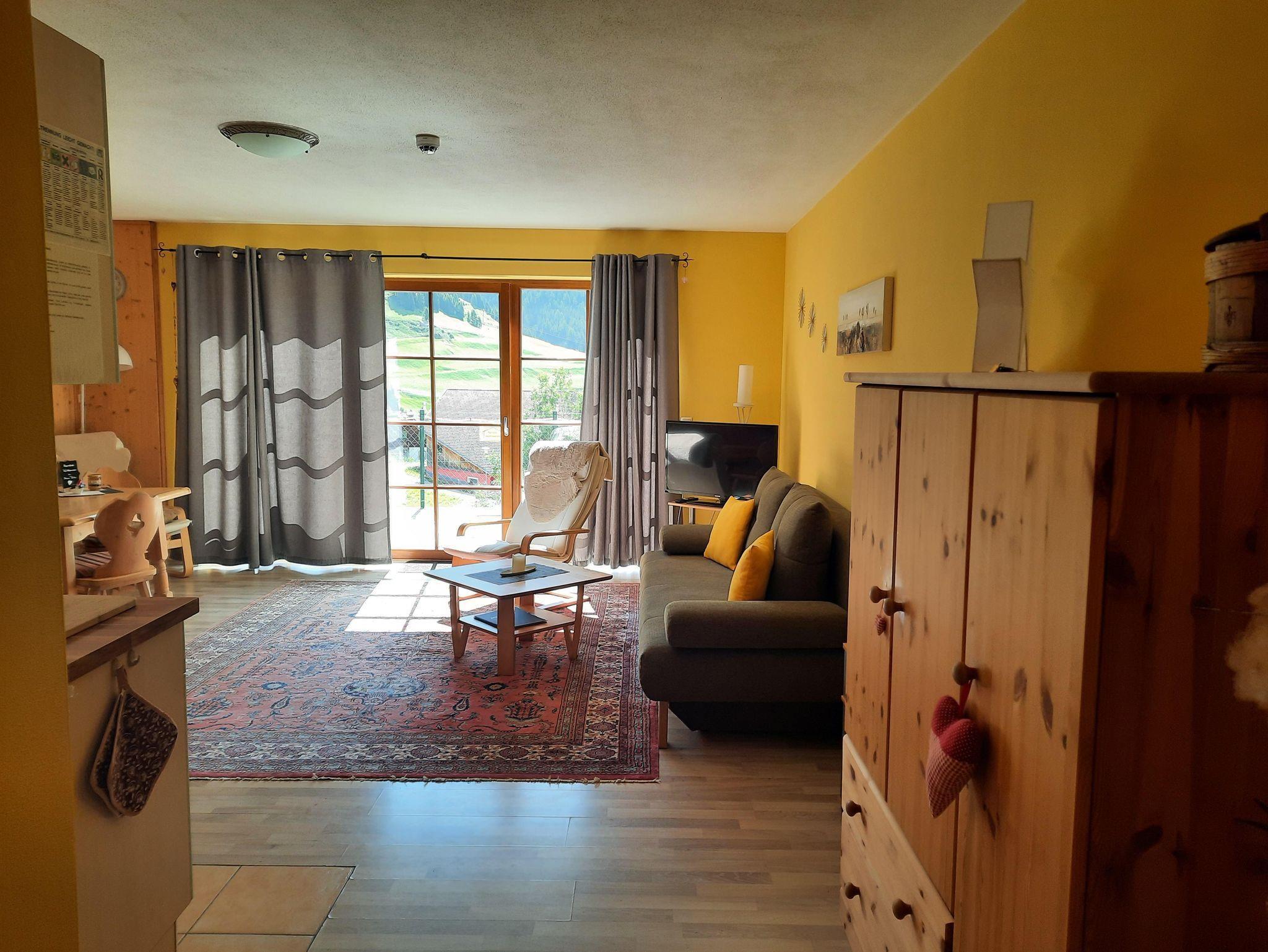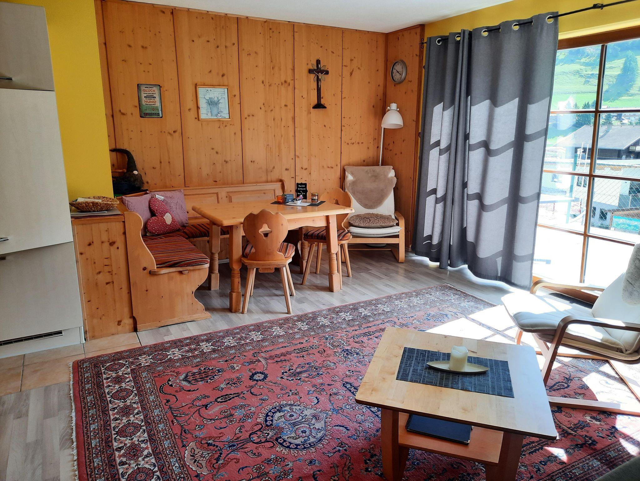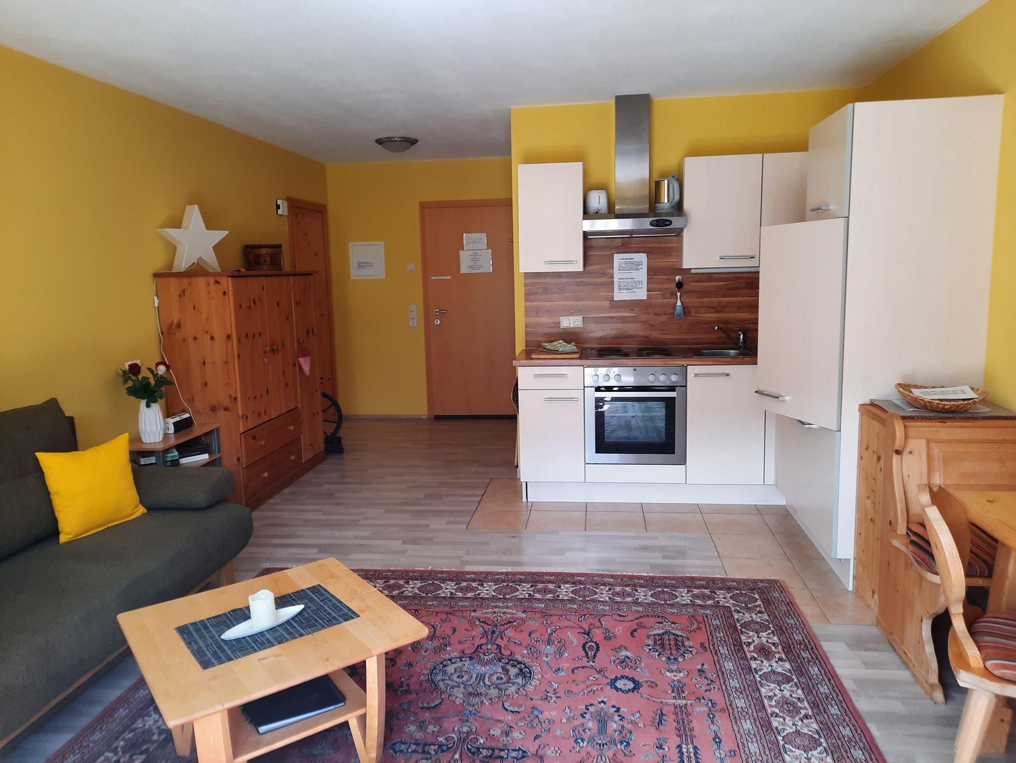 Gemütliche Erdgeschoßwohnung (50 qm) mit Terrasse und Blick über Kals. Voll eingerichtete Einbauküche im großen Wohn/Essbereich, Sitzecke und Schlafsofa für 2. Duschbad mit WC sowie Schlafzimmer mit Doppelbett und großem Kleiderschrank, Gartenmöbel.