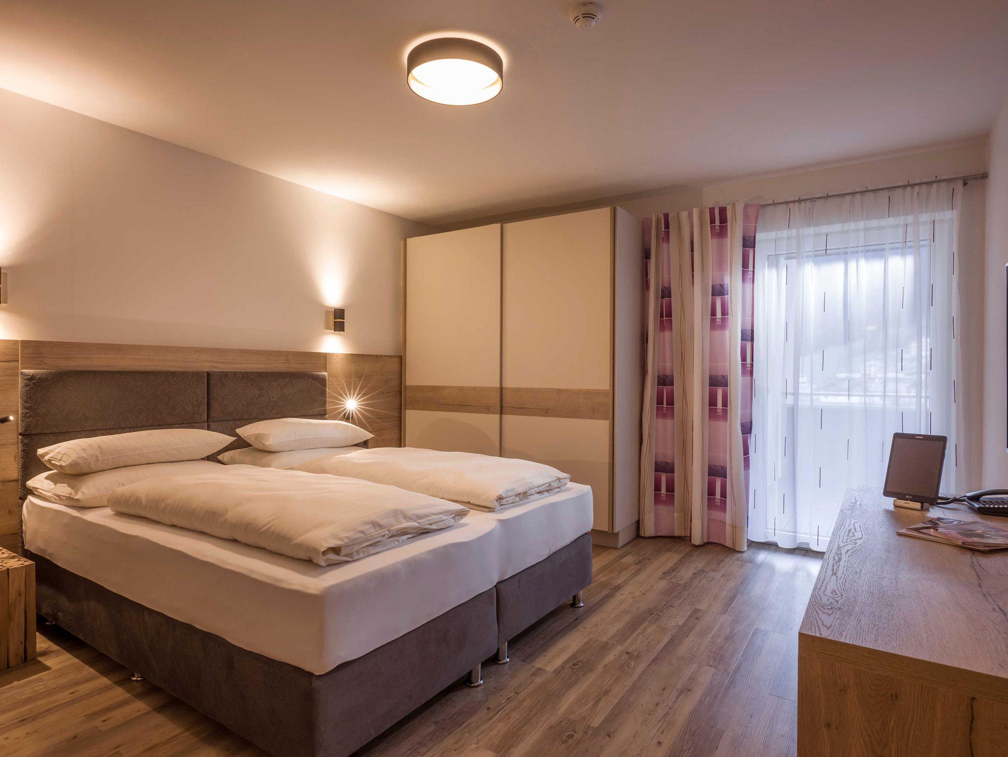 Das Doppelzimmer Hochzillertal verfügt über kuscheliges Boxspring-Bett, Badezimmer mit Multifunktionsdusche, WC, Haarfön und Kosmetikspiegel, Flat-TV, W-LAN, SuitePad (Tablet mit internationalen Tageszeitungen, Internet und Informationen), Safe und Telefon, Balkon mit Blick auf die Zillertaler Bergwelt.