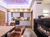 Der Wohnraum der Deluxe Suite Goldreh verbindet einen gemütlichen Sofabereich mit einer Essecke und der hochwertigen, umfassend ausgestatteten Küchenzeile. Ein Flatscreen-TV ist hier ebenso vorhanden wie ein Kamin, welcher vor allem in den kälteren Monaten für wunderbare Behaglichkeit und ein gemütliches Wohnflair sorgt.