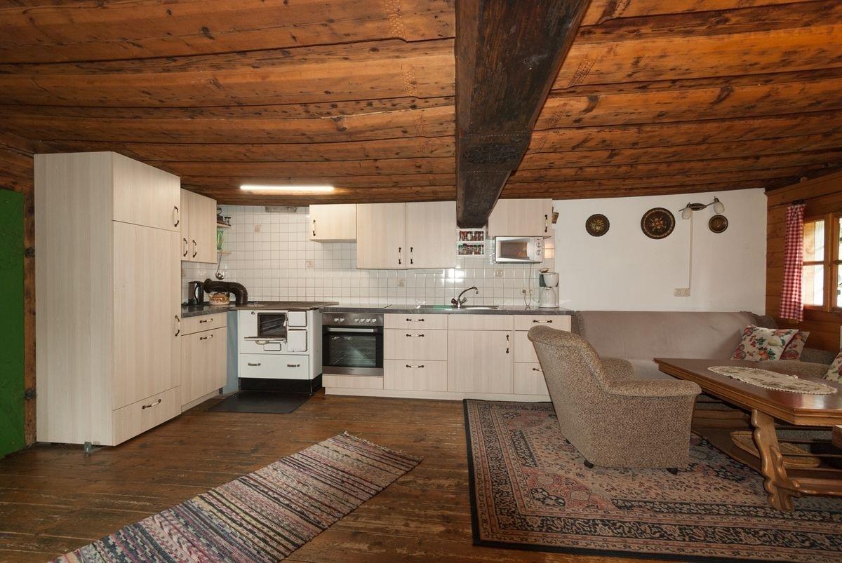 Die Küche ist funktional und stimmig zur Hütte eingerichtet und verfügt über Backofen, Elektroherd, Kühlschrank, Kaffeemaschine und Wasserkocher – perfekt für Selbstversorger, die gerne selbst kochen.