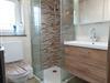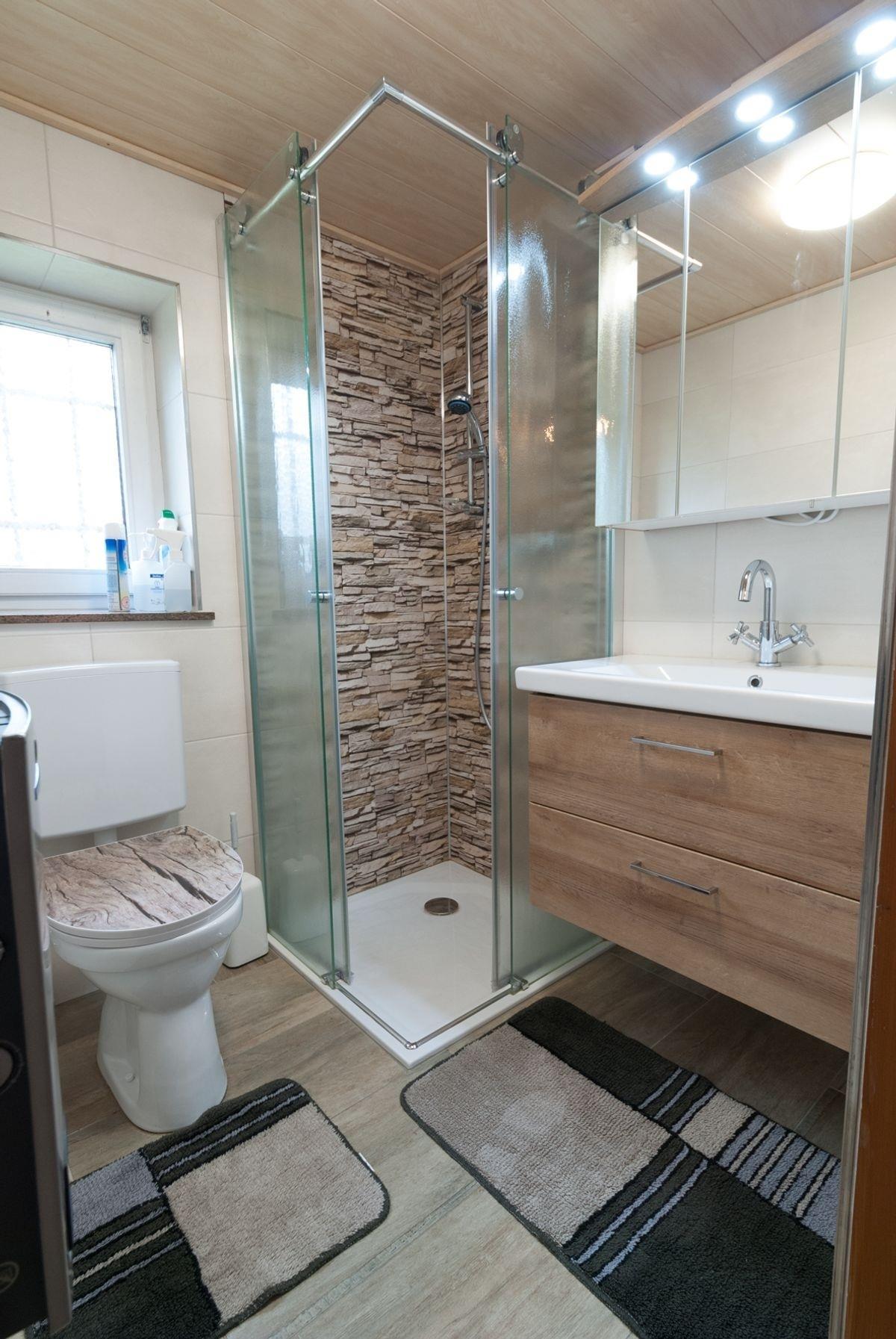Das Badezimmer ist mit Dusche, Waschbecken und WC ausgestattet.