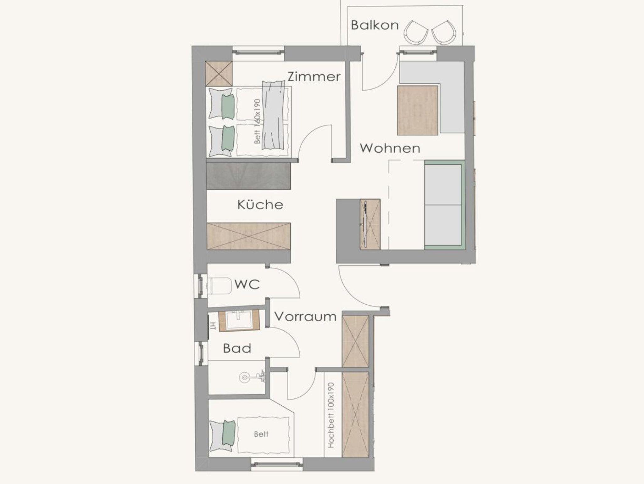 • 2 Schlafzimmer mit 1 Bett 120 x 190 cm und 1 Bett mit 90 x 200 cm (Hochbett)