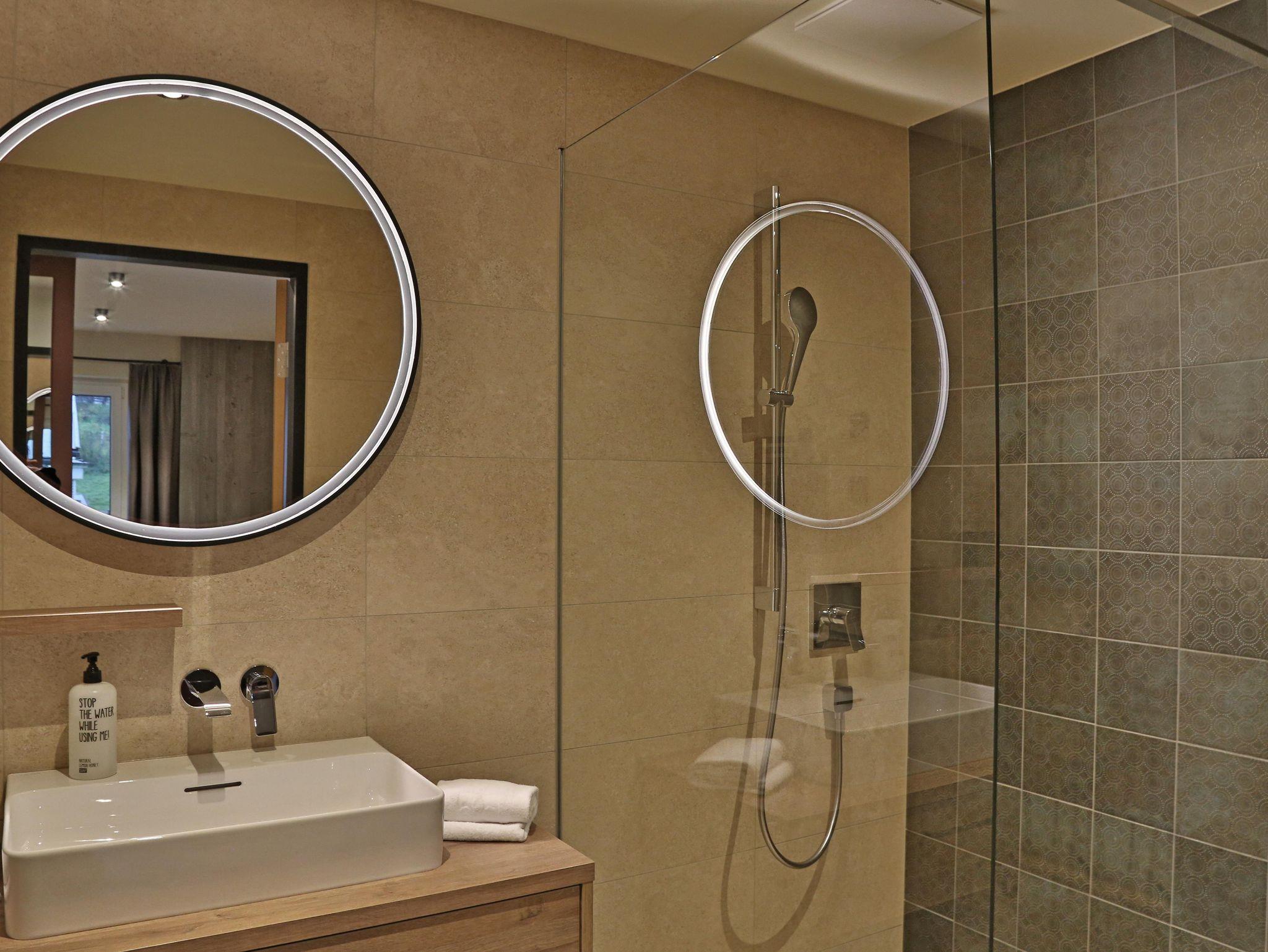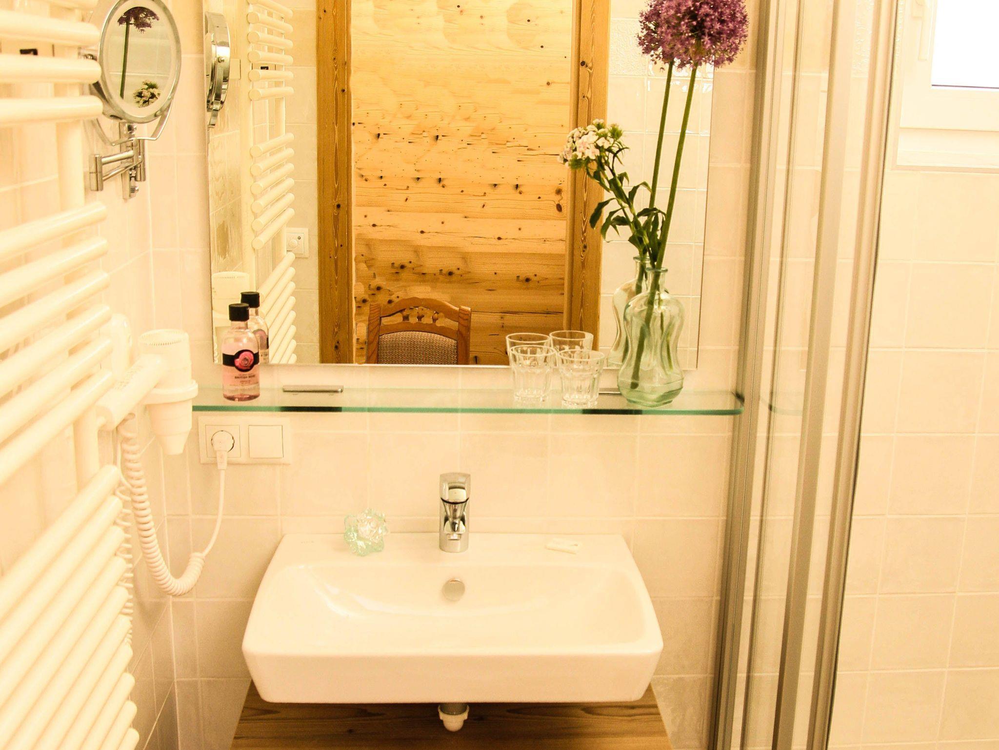 • Badezimmer mit Dusche sowie Handtuchtrockner und Haarföhn, separates WC