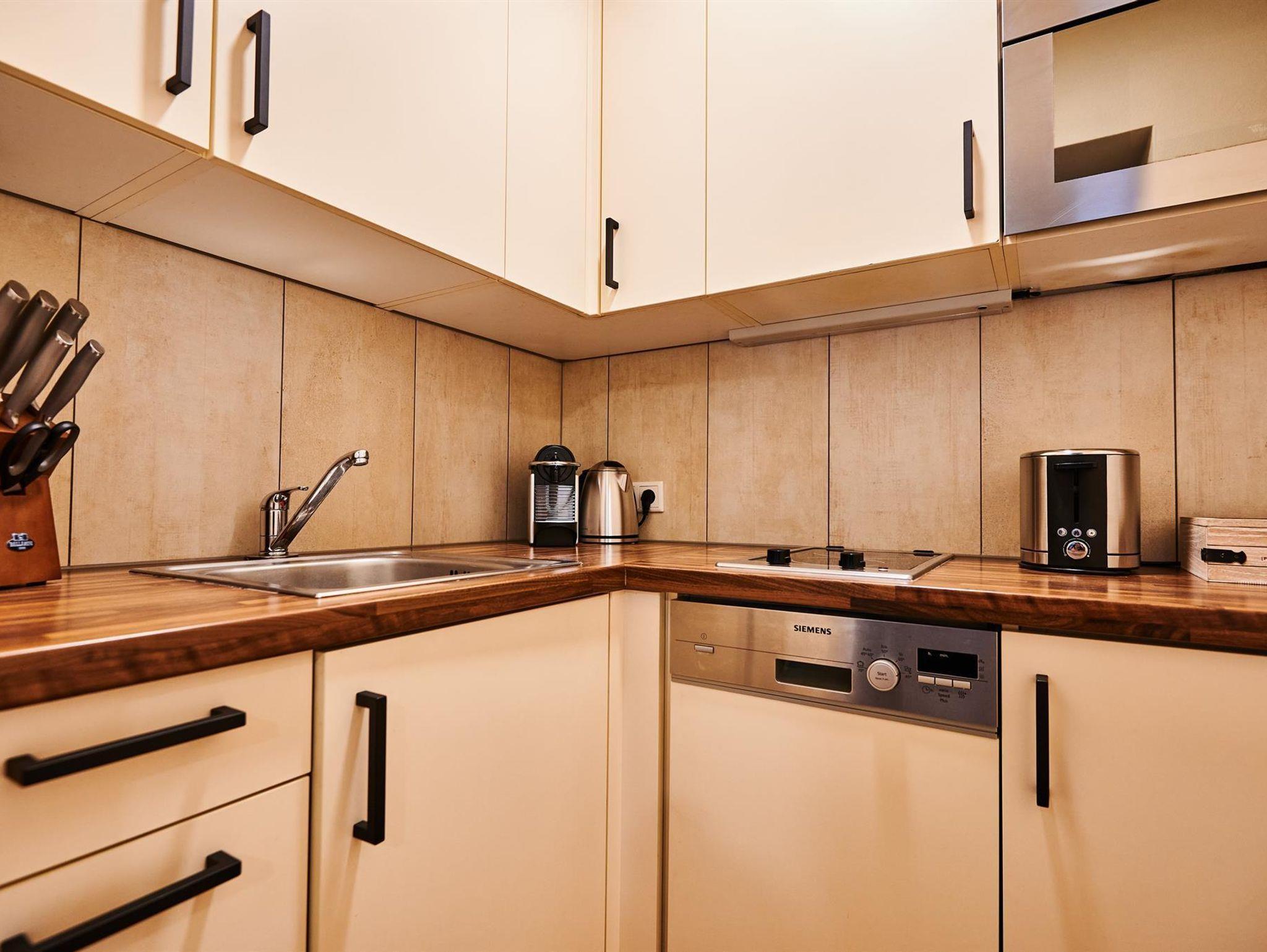 Die offene Küche ist ebenfalls voll ausgestattet: Mit Kaffeemaschine, Toaster und Wasserkocher steht die morgendliche Stärkung in Sekundenschnelle am Frühstückstisch. Kühl-Gefrierkombination, Mikrowelle, Spülmaschine und eine Auswahl an Kochutensilien, bieten alles was du zum Verwöhnen deiner Liebsten am Abend benötigst. Die Unterkunft verfügt weiter über eine allgemeine Waschmaschine, sowie ein Bügeleisen/-brett auf Anfrage.