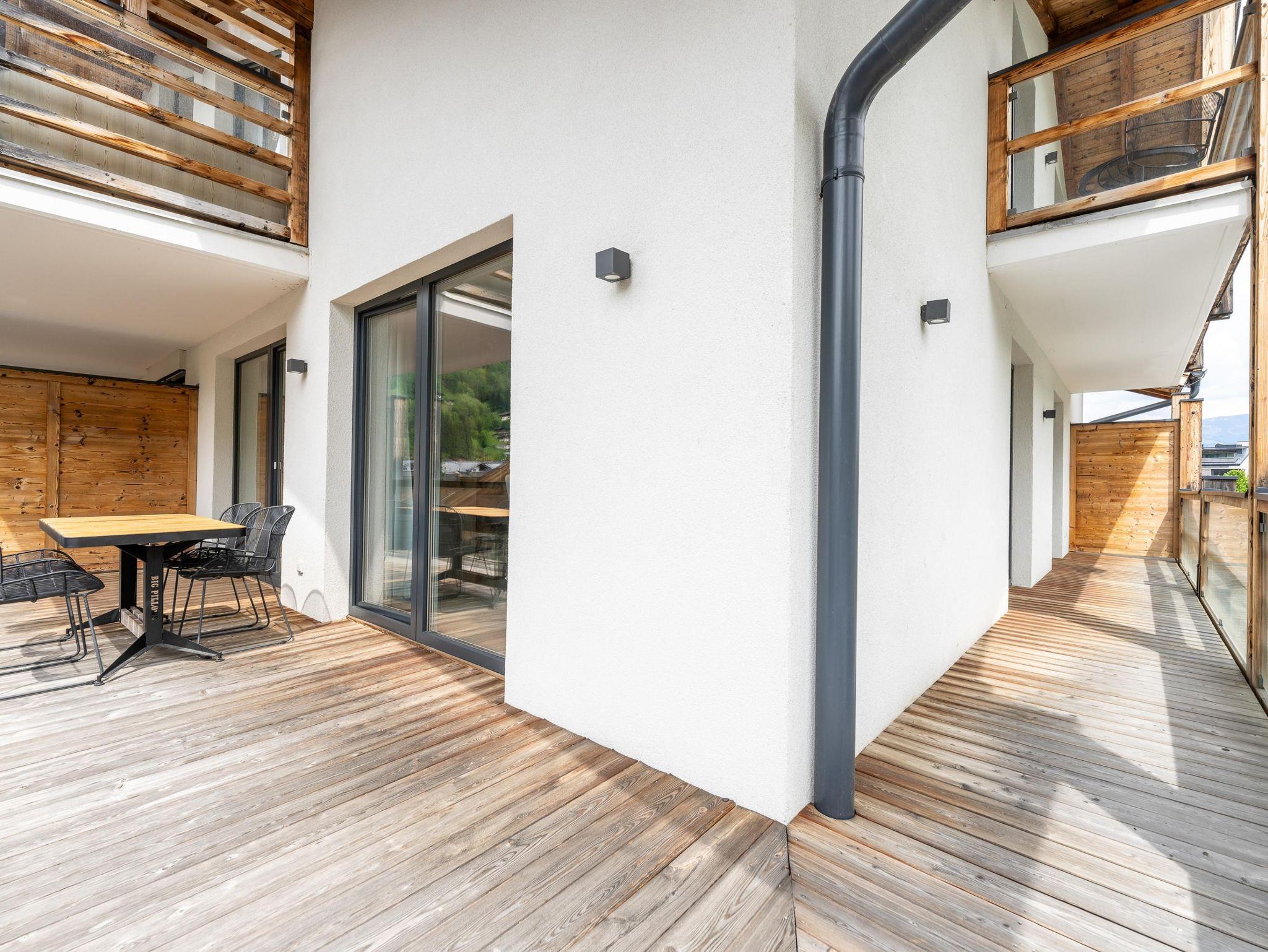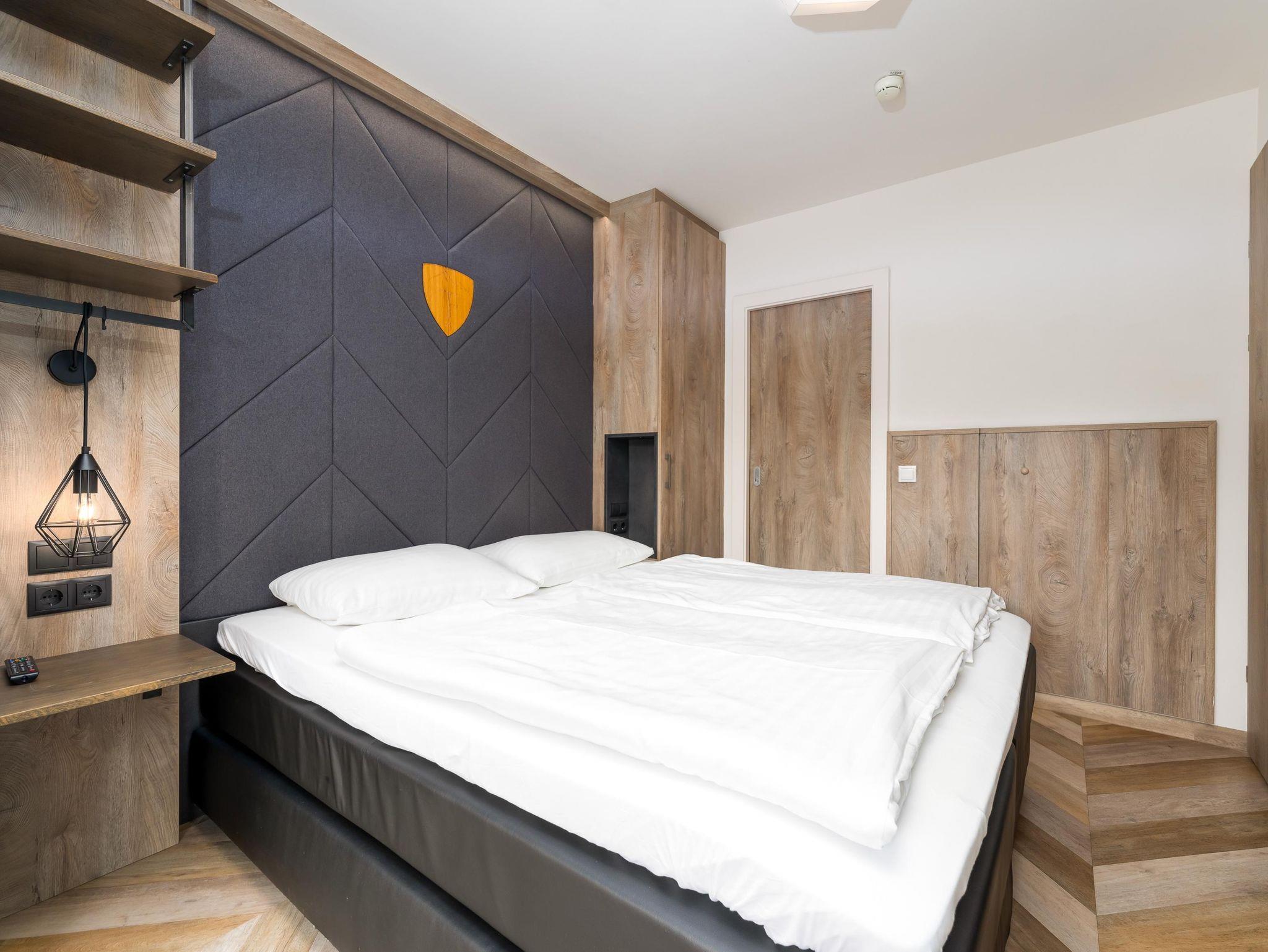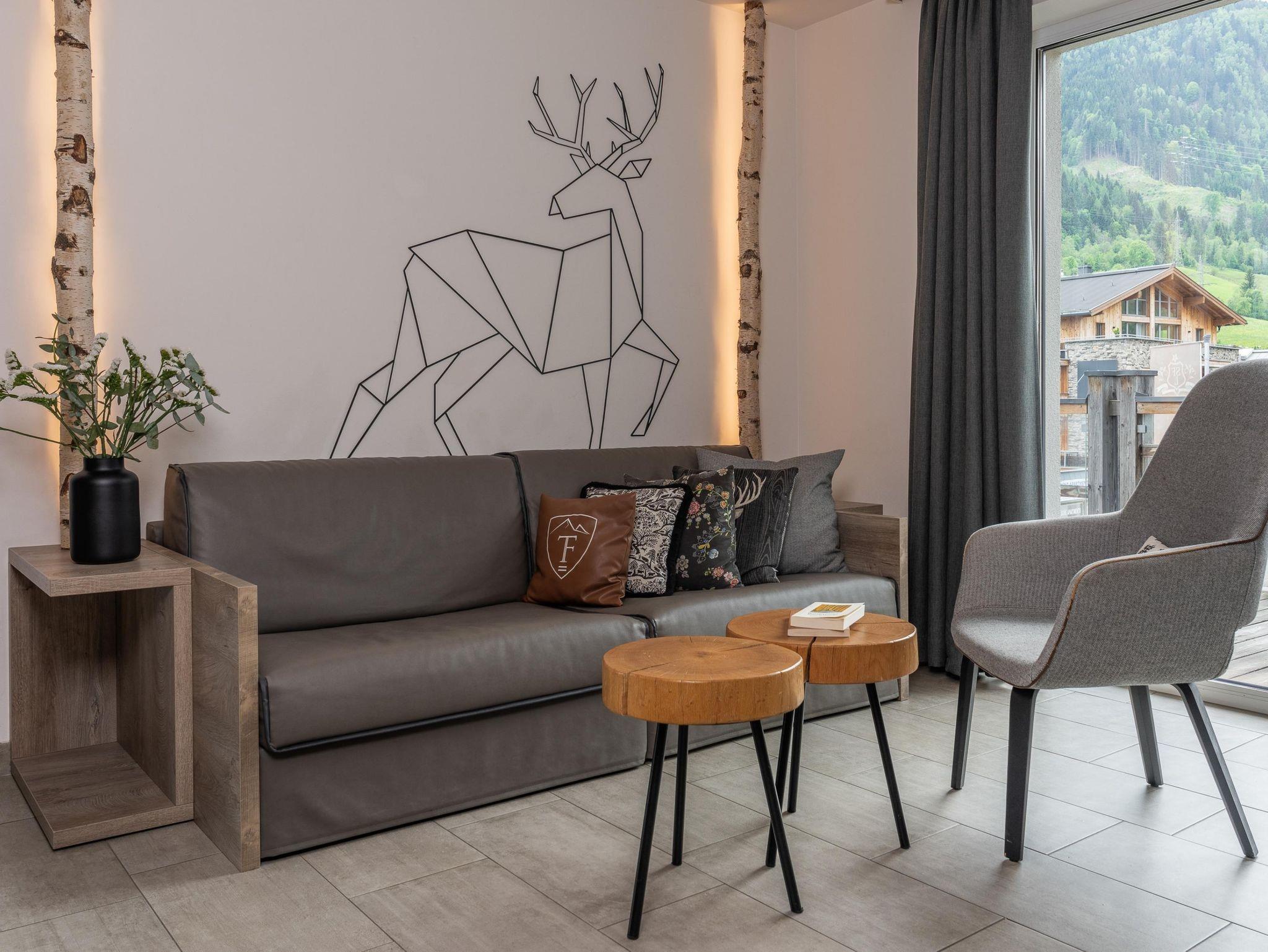 Die Doppelbetten in den beiden Schlafzimmern der Suite, sowie die integrierte Schlafcouch im Wohnbereich bieten Platz für bis zu sechs Personen. Es erwarten Sie zwei Badezimmer mit Dusche und WC und ein offener, hochwertig möblierter Wohnbereich mit einer modernen Küche. Die Holzelemente in der Suite lassen Sie den alpinen Lifestyle spüren. Der gemütliche Esstisch und der private Balkon sind der perfekte Platz, um ein gutes Glas Wein zu genießen und einen spannenden Tag in den Bergen Revue passieren zu lassen.