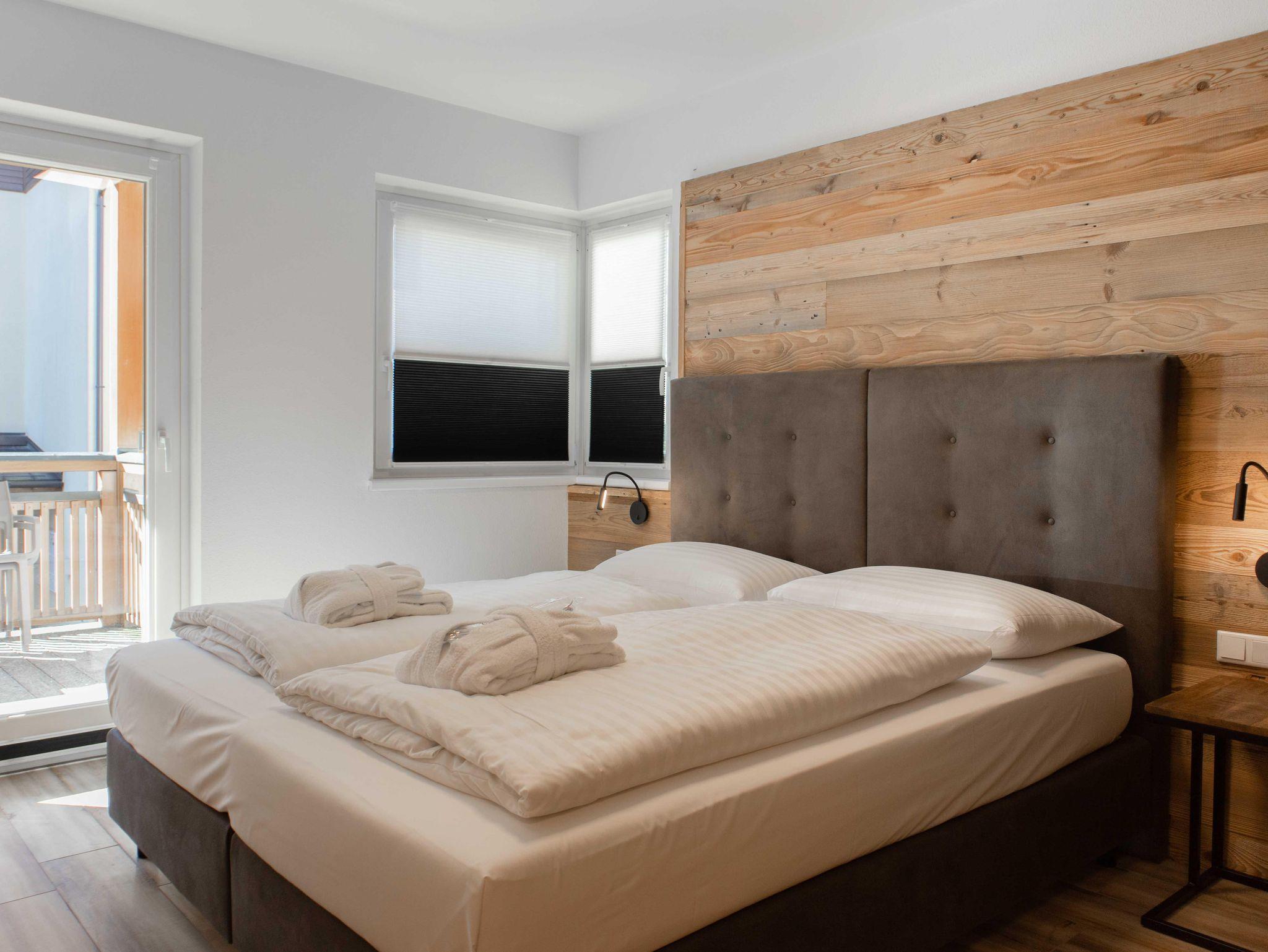 Das Deluxe Apartment mit drei Schlafzimmern liegt im ersten Stock. Alle Schlafzimmer sind mit einem Doppelbett, Fernseher und viel Schrankfläche ausgestattet. Es gibt zwei Badezimmer mit Dusche/Badewanne, Waschbecken und Toilette. Über den Flur betritt man das komfortable Wohnzimmer, das mit einer gemütlichen Sitzecke samt Schlafcouch ausgestattet ist. Ein großzügiger Esstisch und die offene Design-Küche sind das Herz des Wohnraums. Das Apartment verfügt über zwei große geschützte Balkon welche vom Wohn-, und Schlafzimmer erreichbar sind.