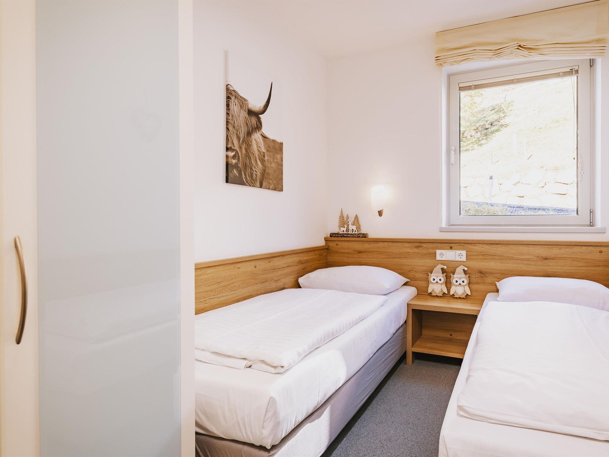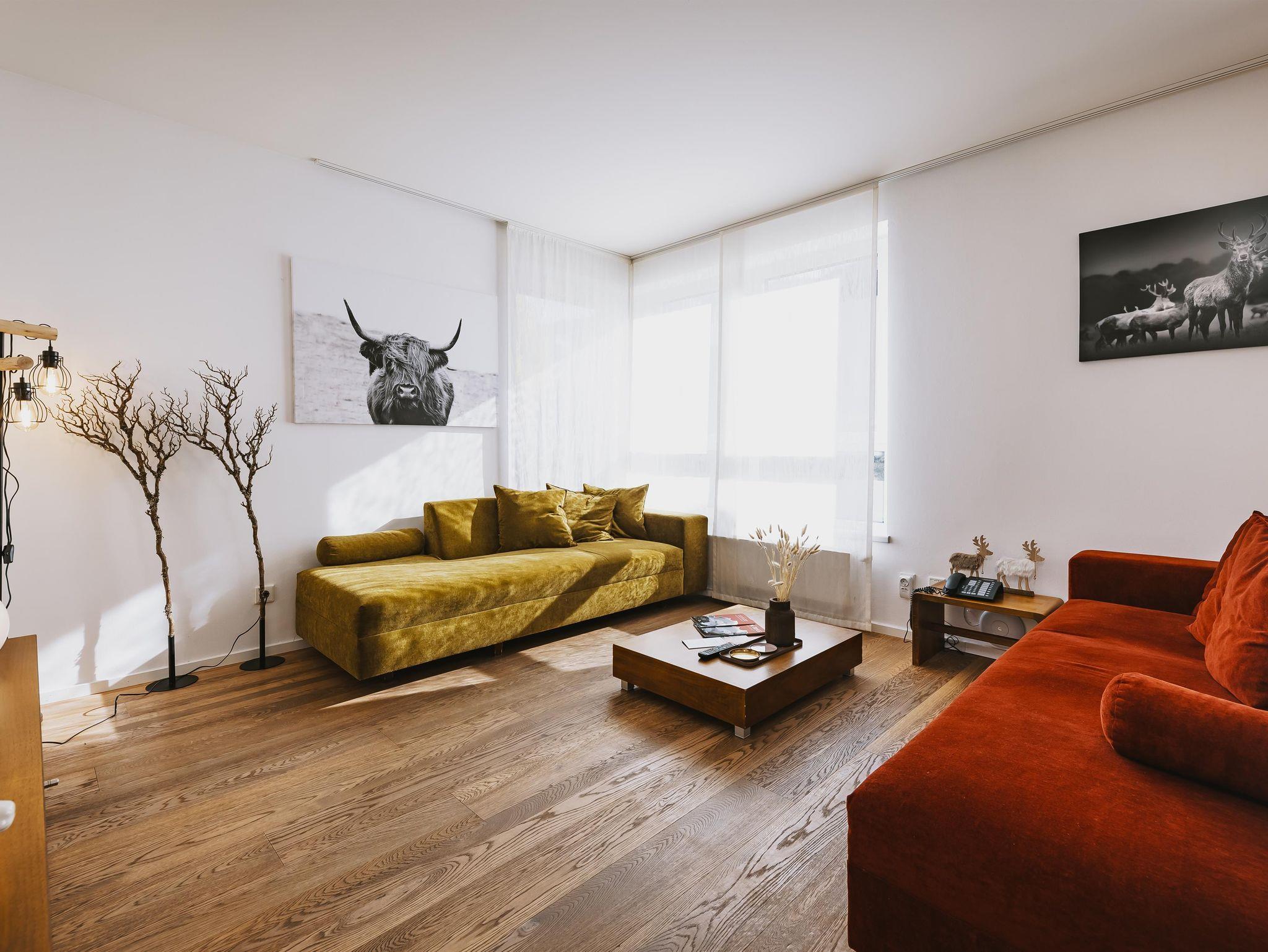 Dieses Apartment im Erdgeschoss bietet Platz für bis zu vier Personen. Es besteht aus zwei Schlafzimmern, einem mit Doppelbett und einem mit zwei Einzelbetten. Das geräumige Bad ist mit einer Dusche, einer Toilette und einem Handtuchwärmer ausgestattet. Ein großzügiger, heller Wohnbereich mit einer gemütlichen Sitzecke bietet reichlich Platz zum Entspannen. Die voll ausgestattete Küche und der große Esstisch ergänzen das Angebot. Auf der Terrasse bietet sich ein schöner Blick auf die Berge.
