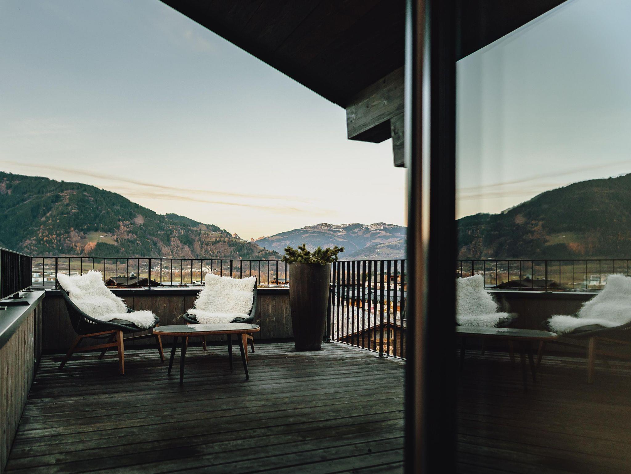 • Terrasse mit Ausblick über den Dächern von Kaprun