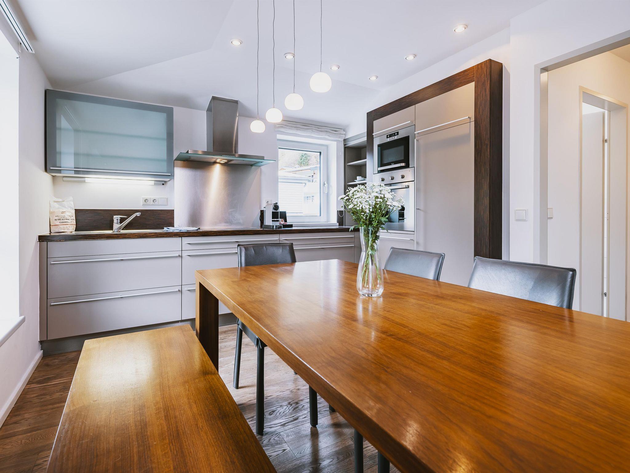 Das geräumige Penthouse mit traumhaftem Blick auf das Kitzsteinhorn bietet Platz für 6-8 Personen. Die drei Schlafzimmer sind gemütlich eingerichtet, einmal mit einem Doppelbett und eigenem Bad mit Badewanne, die anderen beiden mit jeweils zwei Einzelbetten. Ein Highlight ist der große, mit Holz verkleidete Wohnraum. Eine geräumige, voll ausgestattete Küche und ein großer Esstisch bieten viel Platz. Auf dem Balkon genießt man die traumhaften Ausblicke auf den Gletscher, über ganz Kaprun bis hin zur Burg.
