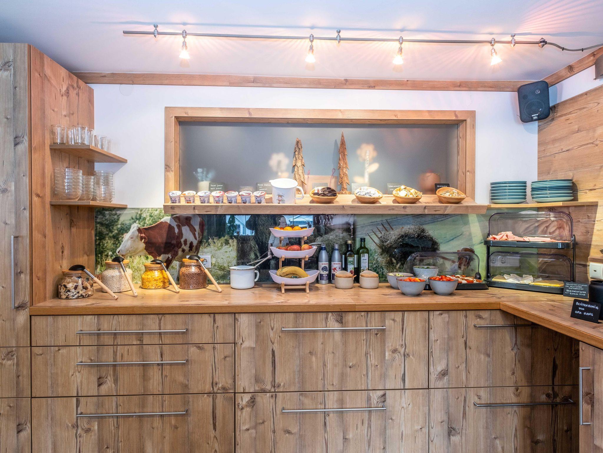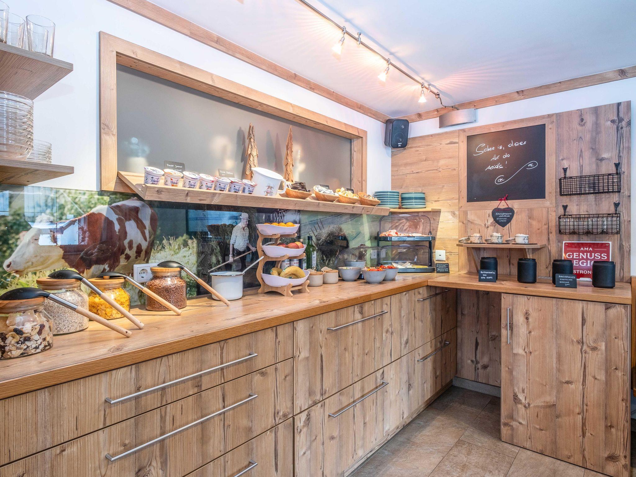 • 100% regionales Frühstückbuffet mit frischen, selbstgemachten und qualitativ hochwertigen Produkten auf der Panorama Terrasse Sommer wie Winter