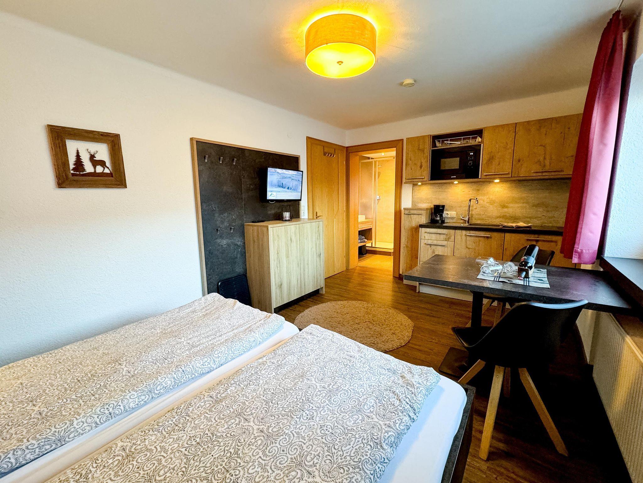 Ein separates Schlafzimmer mit Doppelbett sorgt für Privatsphäre und erholsamen Schlaf. Das Badezimmer ist mit Dusche und WC ausgestattet. Der Balkon mit Morgensonne begeistert mit einem herrlichen Ausblick auf die umliegende Berglandschaft – ein perfekter Start in den Tag!