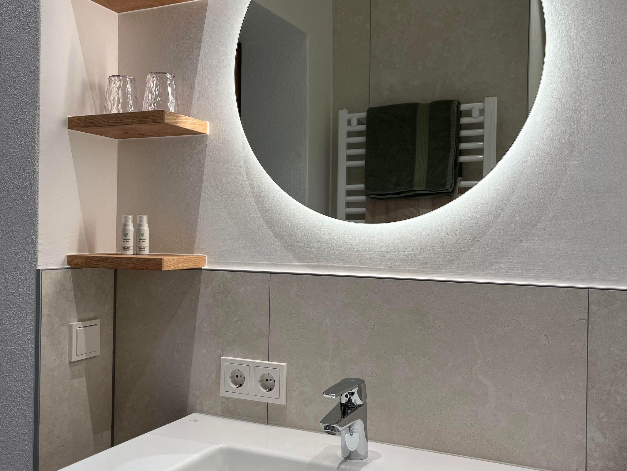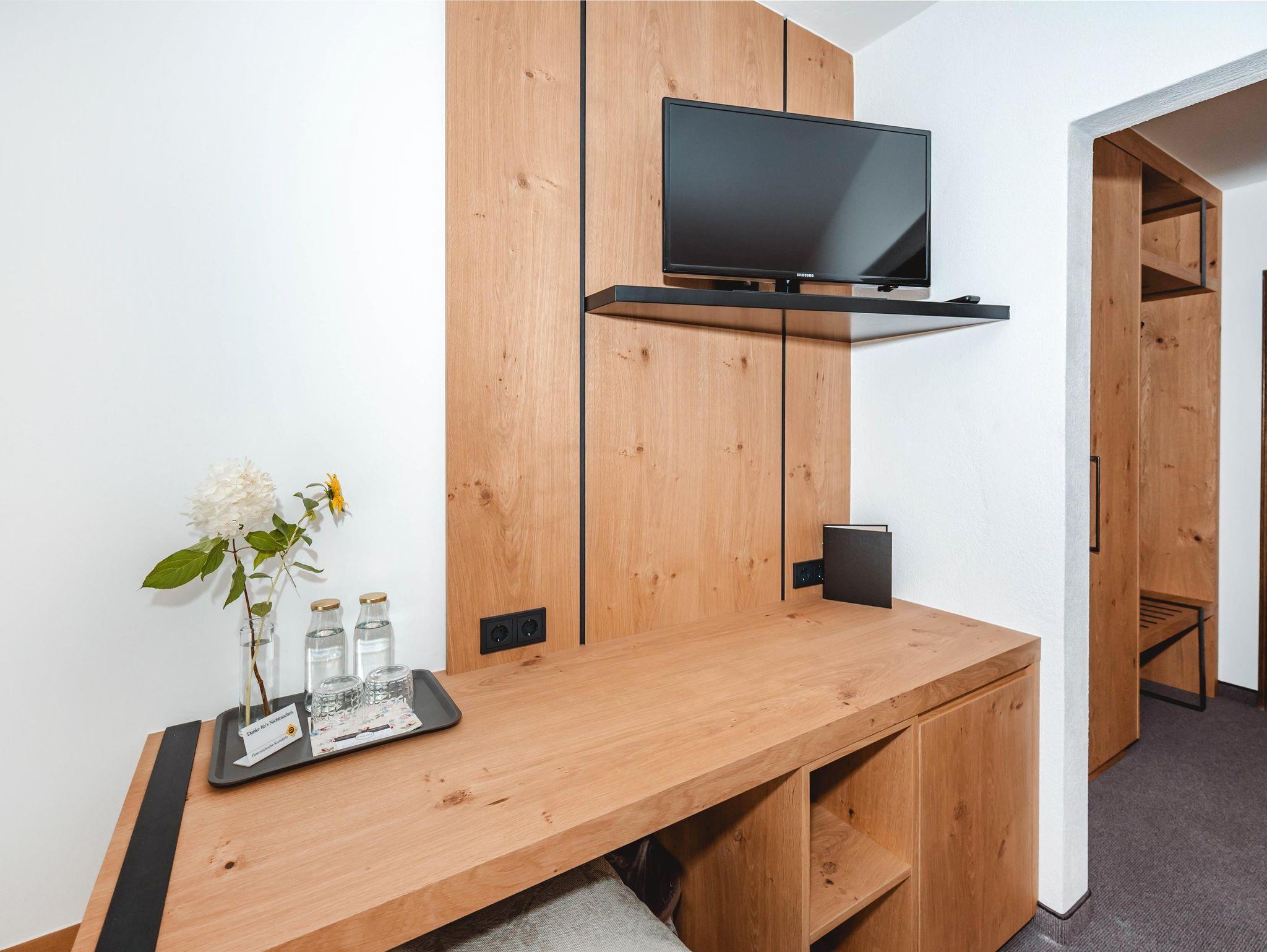 Das Zimmer ist mit einem großes Doppelbett, Schreibtisch, Flat-TV, Dusche, WC, Handtüchertrockner, W-Lan, Föhn und Badeartikel ausgestattet.