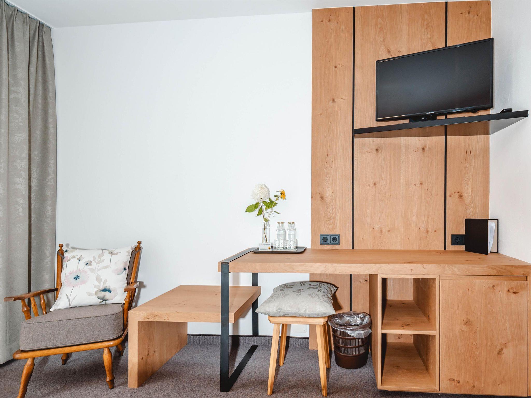 Das neu renovierte Doppelzimmer ist mit natürlichen und hochwertigen Materialien umgesetzt worden.