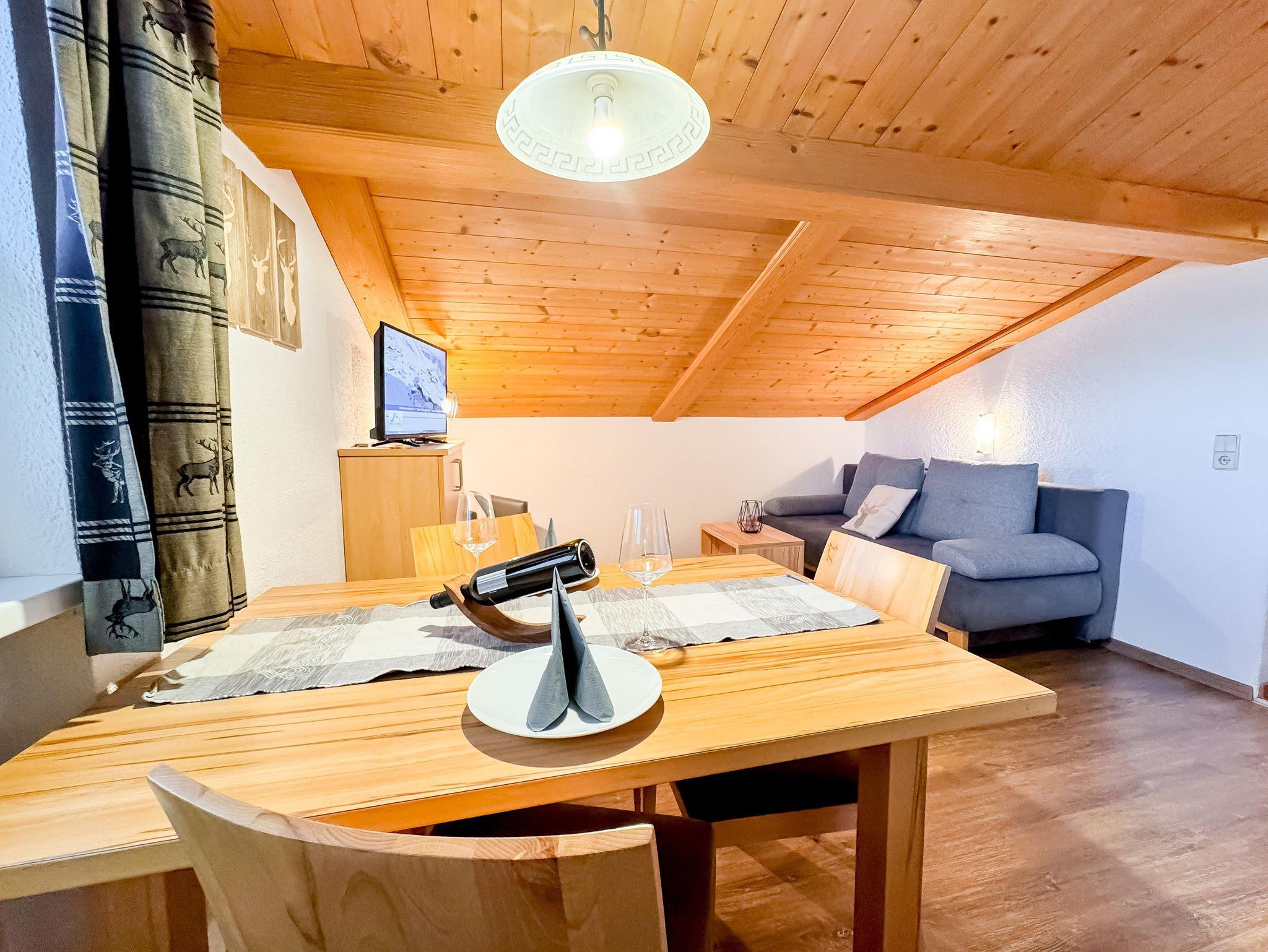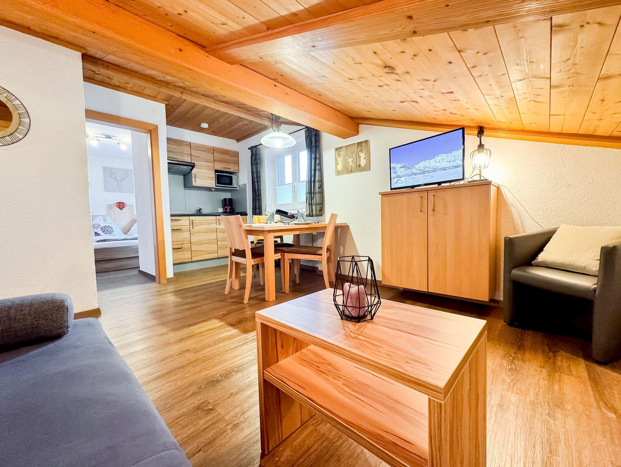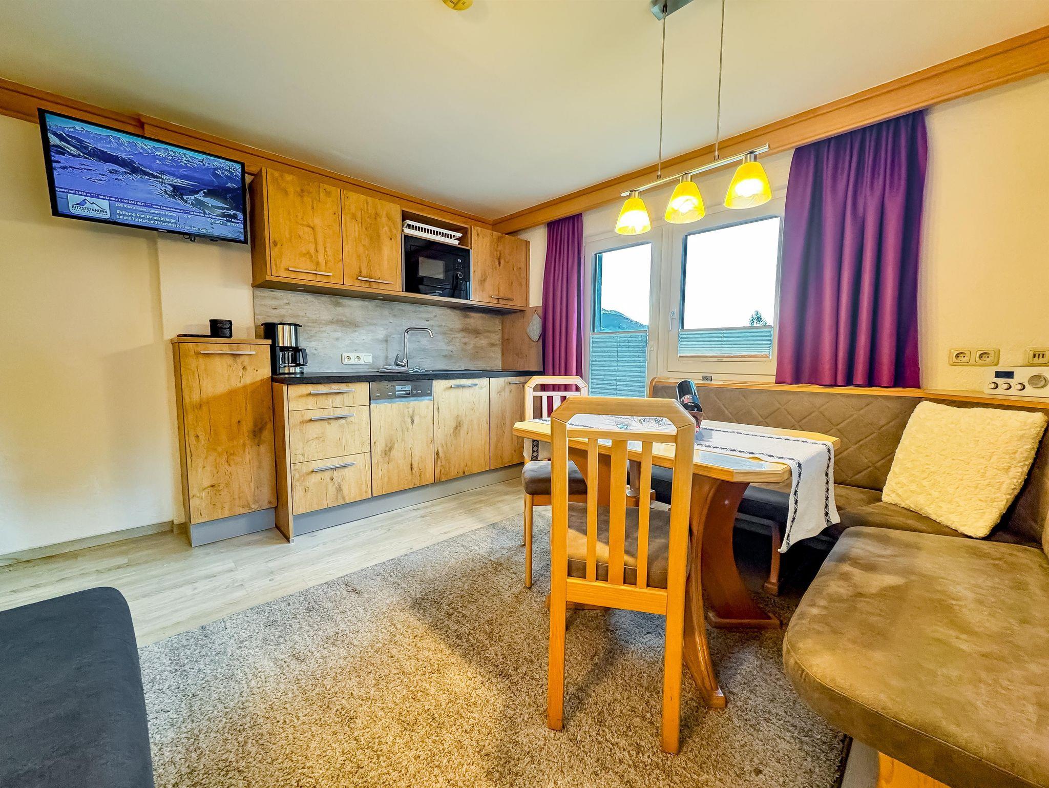 Die integrierte Küchenzeile ist ausgestattet und lädt zum Kochen ein. Das Badezimmer verfügt über eine Dusche und ein WC. Ein Highlight ist der Balkon mit Morgensonne, der herrliche Ausblicke auf die umliegende Bergwelt bietet – ideal zum Entspannen nach einem aktiven Tag in der Region.