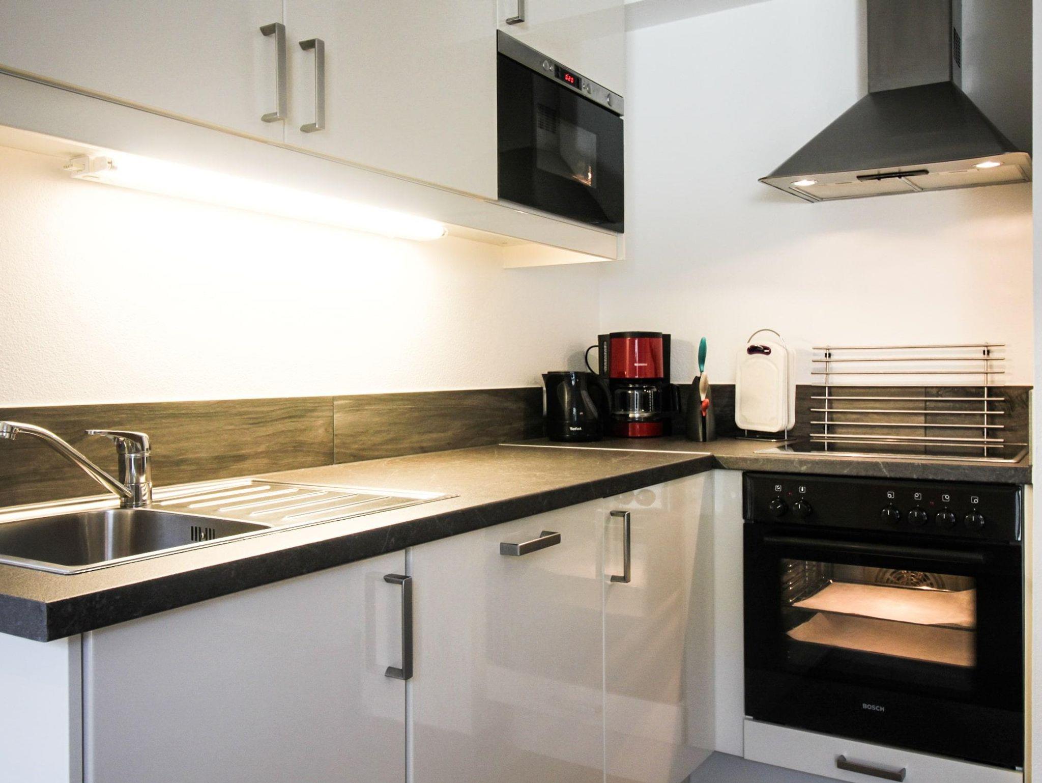• Küche mit Backofen, Herd, Mikrowelle und Geschirrspüler