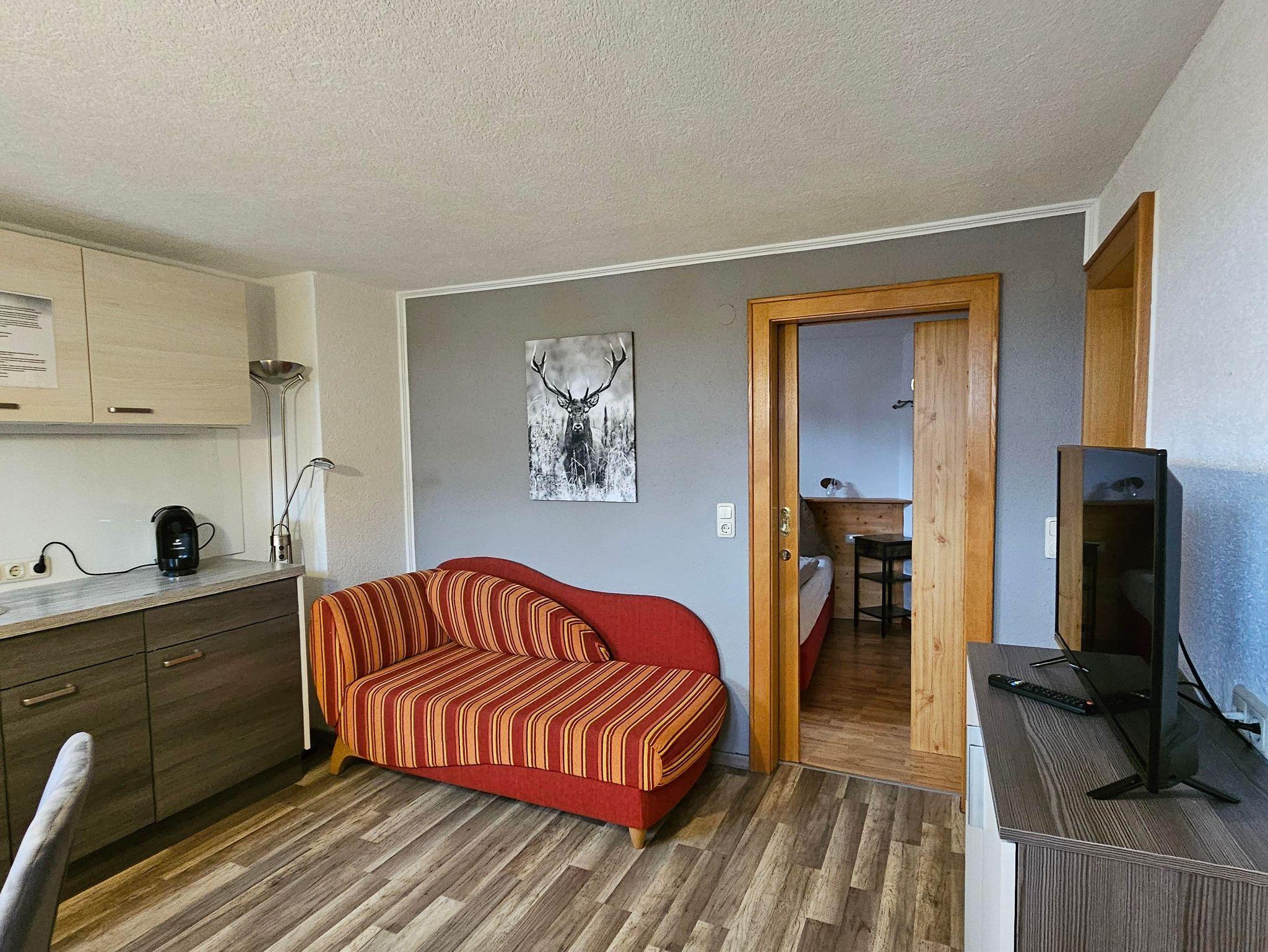 1 Schlafzimmer, 1 Wohn-Schlafraum mit Küchenblock, komplett ausgestattet 2 Platten E-Herd, Dusche, WC, Flat Sreen TV, Radio. Gratis Online-Zugang zum Internet für Laptops in den Appartements