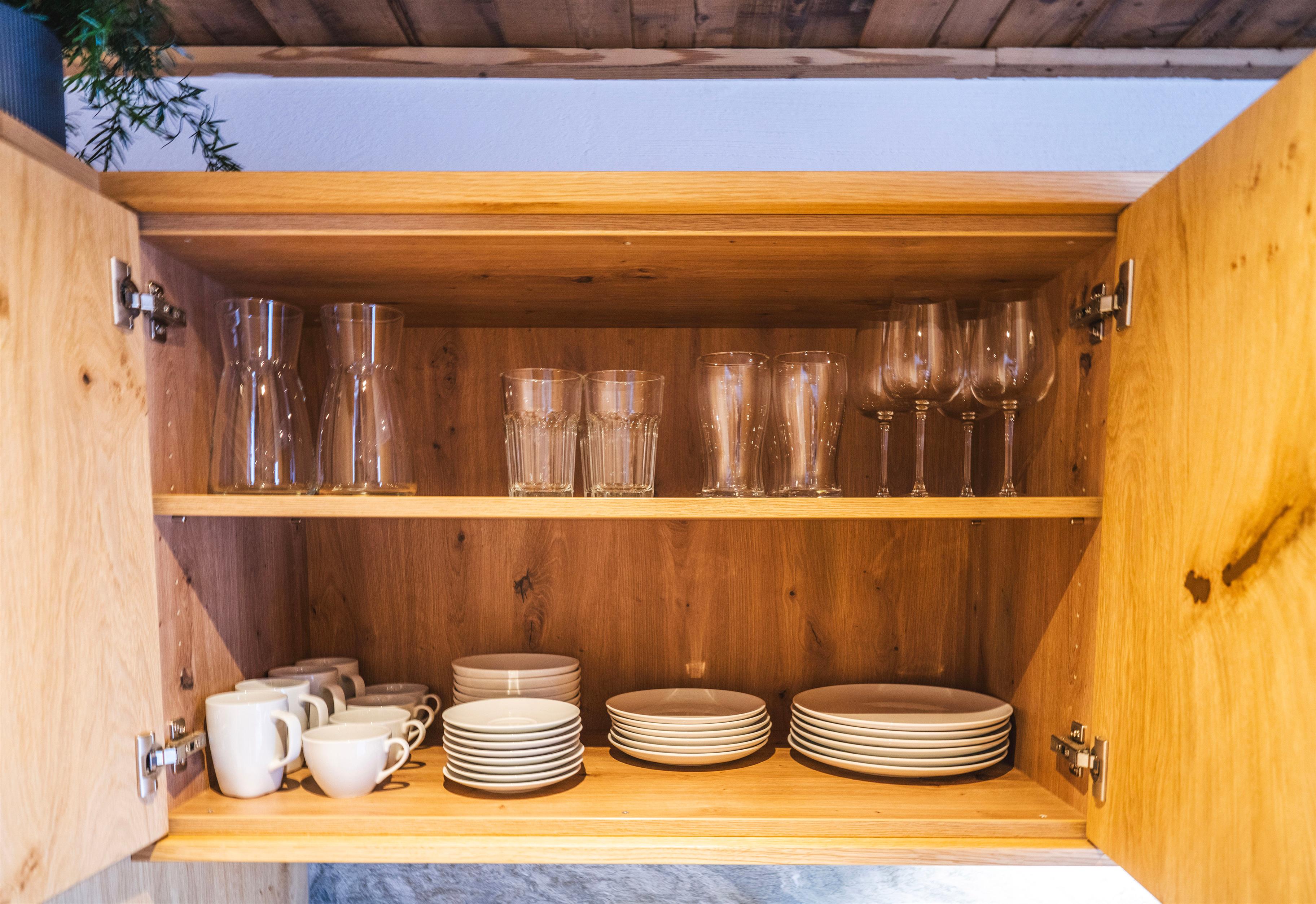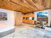 Diese gemütliche Ferienwohnung im alpinen Stil bietet eine warme und einladende Atmosphäre für Ihren Aufenthalt. Der Wohnbereich ist geprägt von natürlichen Holzelementen, die für ein rustikales und gleichzeitig charmantes Ambiente sorgen. Eine Sitzecke mit Eckbank und Esstisch lädt zu gemeinsamen Mahlzeiten oder gemütlichen Abenden ein. Der Raum ist mit hochwertigen Holzmöbeln ausgestattet, darunter eine praktische Küchenzeile, ein Fernsehbereich. Die großen Fenster mit traditionellen Vorhängen sorgen für viel Tageslicht und bieten Zugang zu einem Balkon mit Blick auf die Umgebung. Ein dekorativer Kuhfell-Teppich verleiht dem Raum zusätzlichen alpinen Charme. Hier erleben Sie eine perfekte Mischung aus Tradition und Komfort, ideal für einen erholsamen Urlaub in den Bergen.