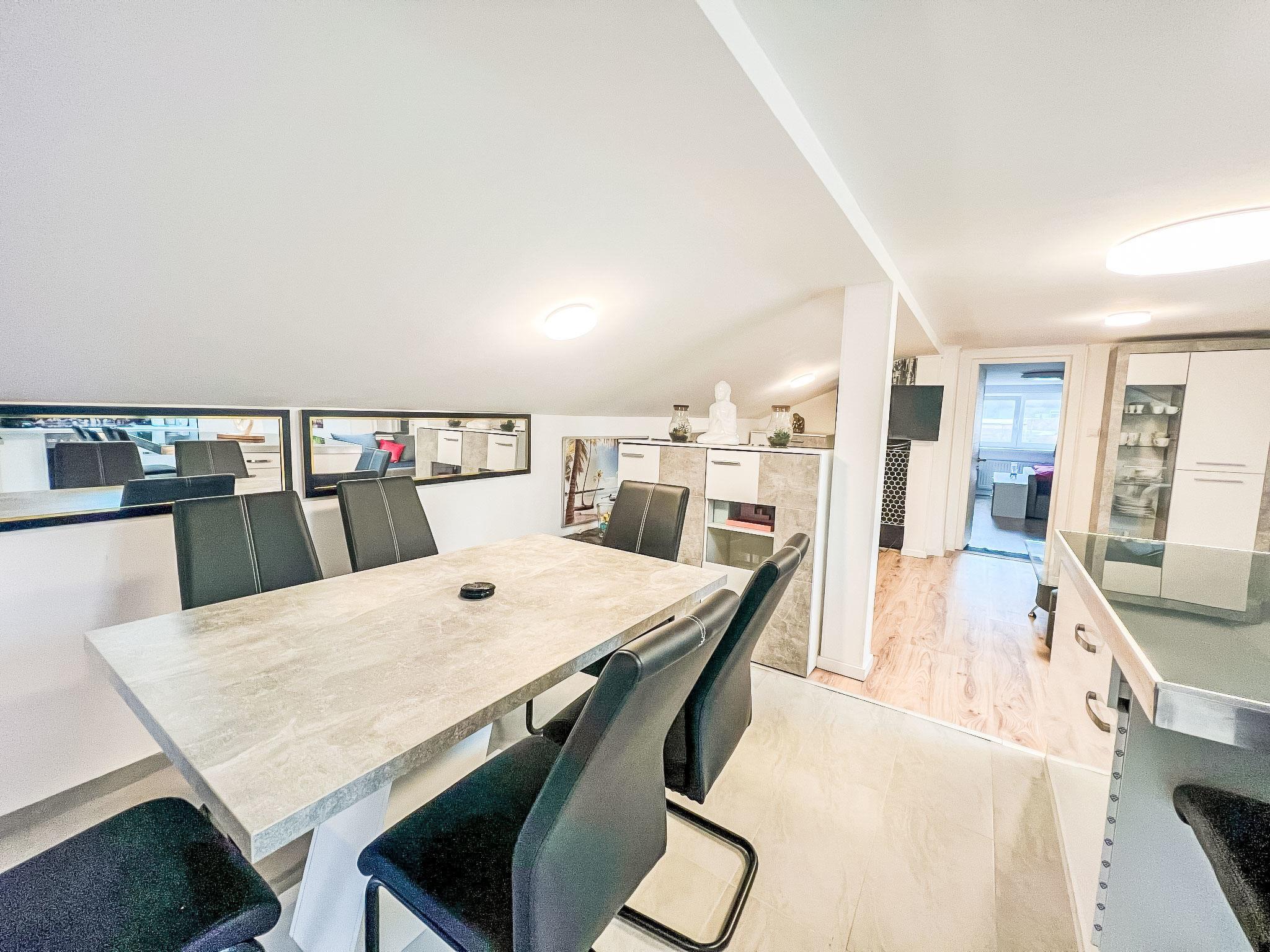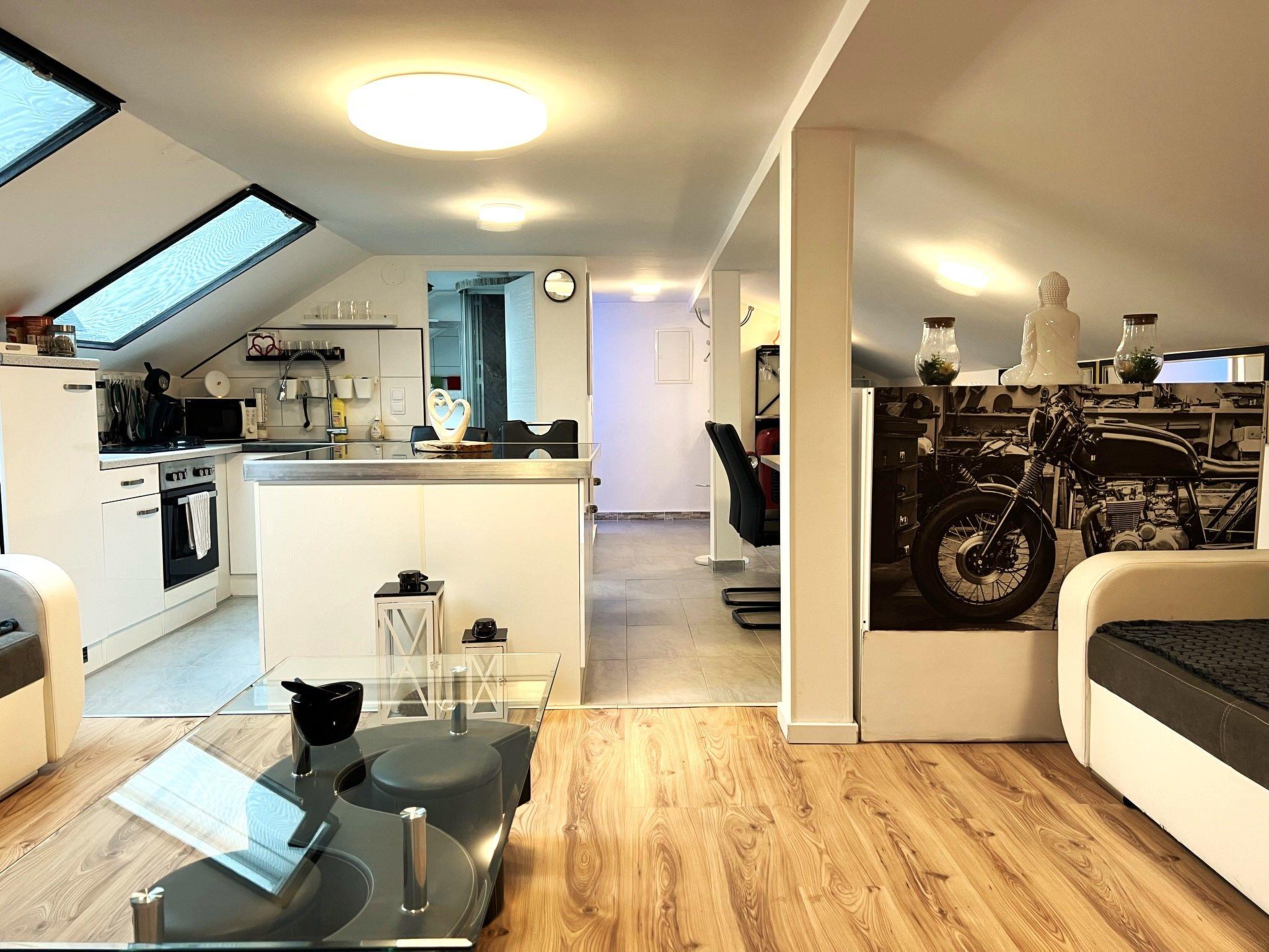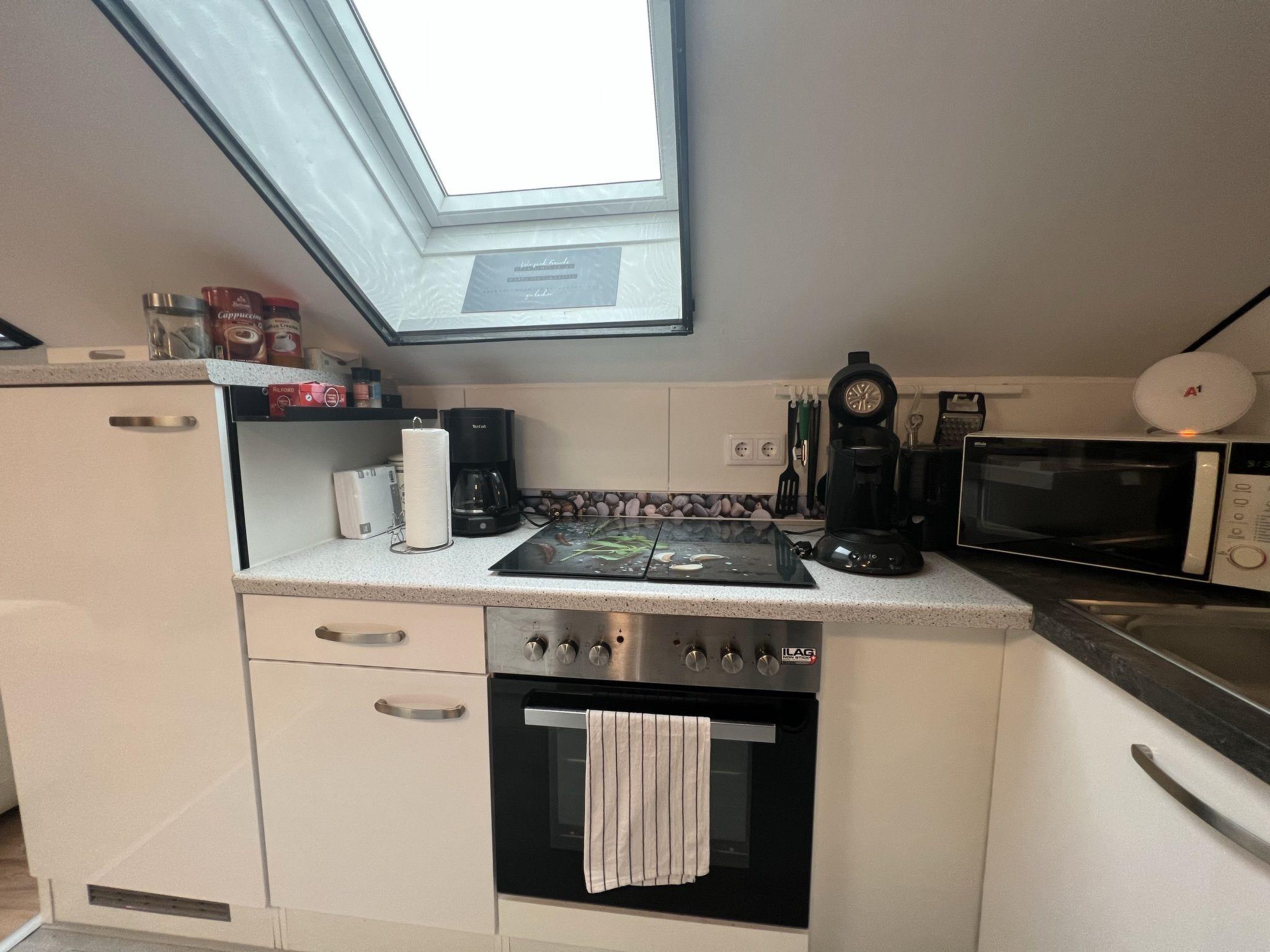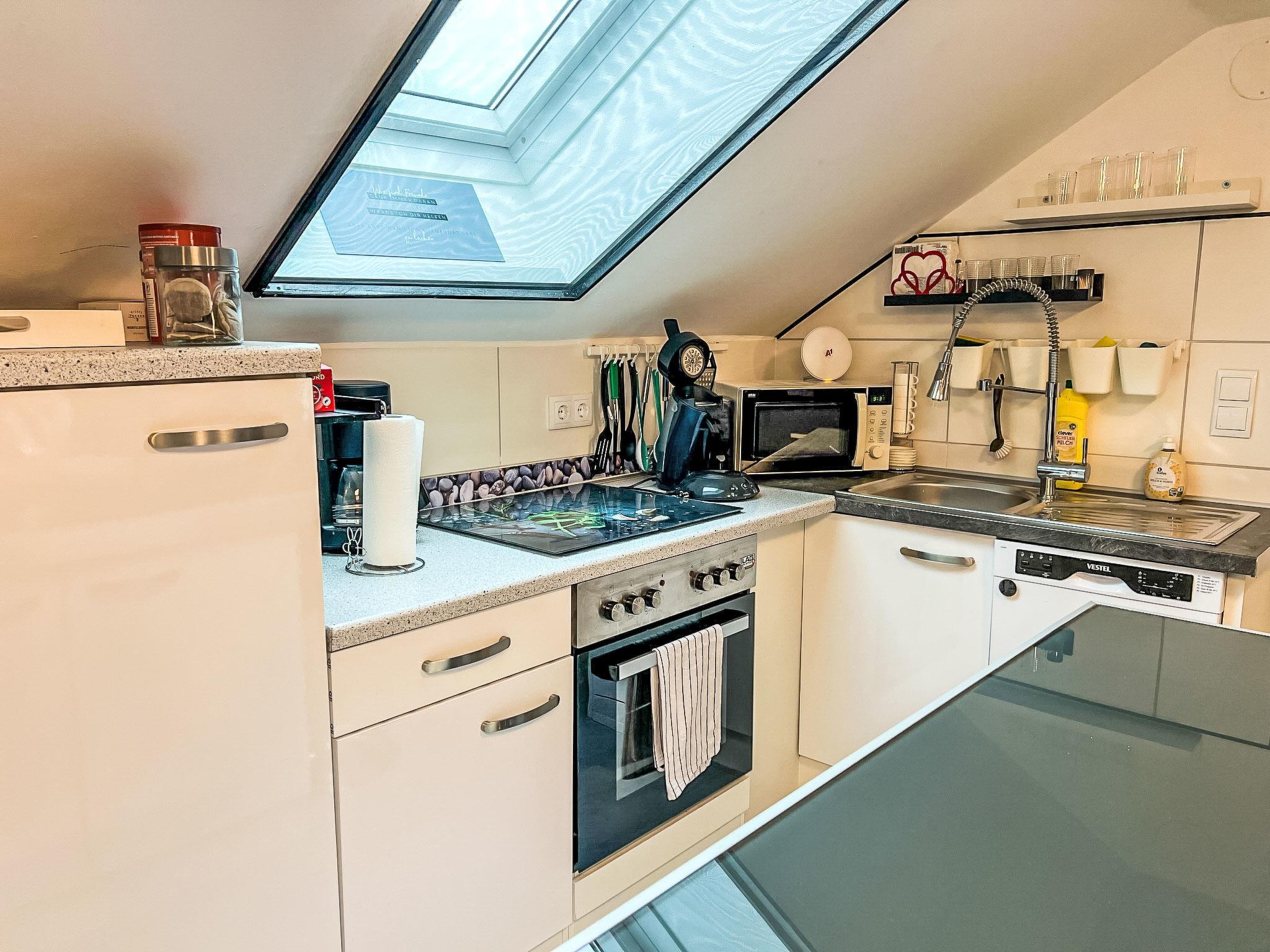 2-room apartment 70 m2 on 1st floor. Spacious and bright, partly with sloping ceilings, renovated in 2022, very comfortable and stylish furnishings: living/sleeping room with sloping ceilings with rooflight with 2 double sofabeds, TV and international TV channels (flat screen). 1 double bedroom with Dressing room. Open kitchen (4 hot plates, oven, dishwasher, kettle, microwave, electric coffee machine) with dining table and bar. Shower/WC. Electric heating. Parquet floors. Very beautiful view of the mountains. Facilities: washing machine, hair dryer. Internet (WiFi, free). Please note: non-smokers only. Maximum 2 pets/ dogs allowed.