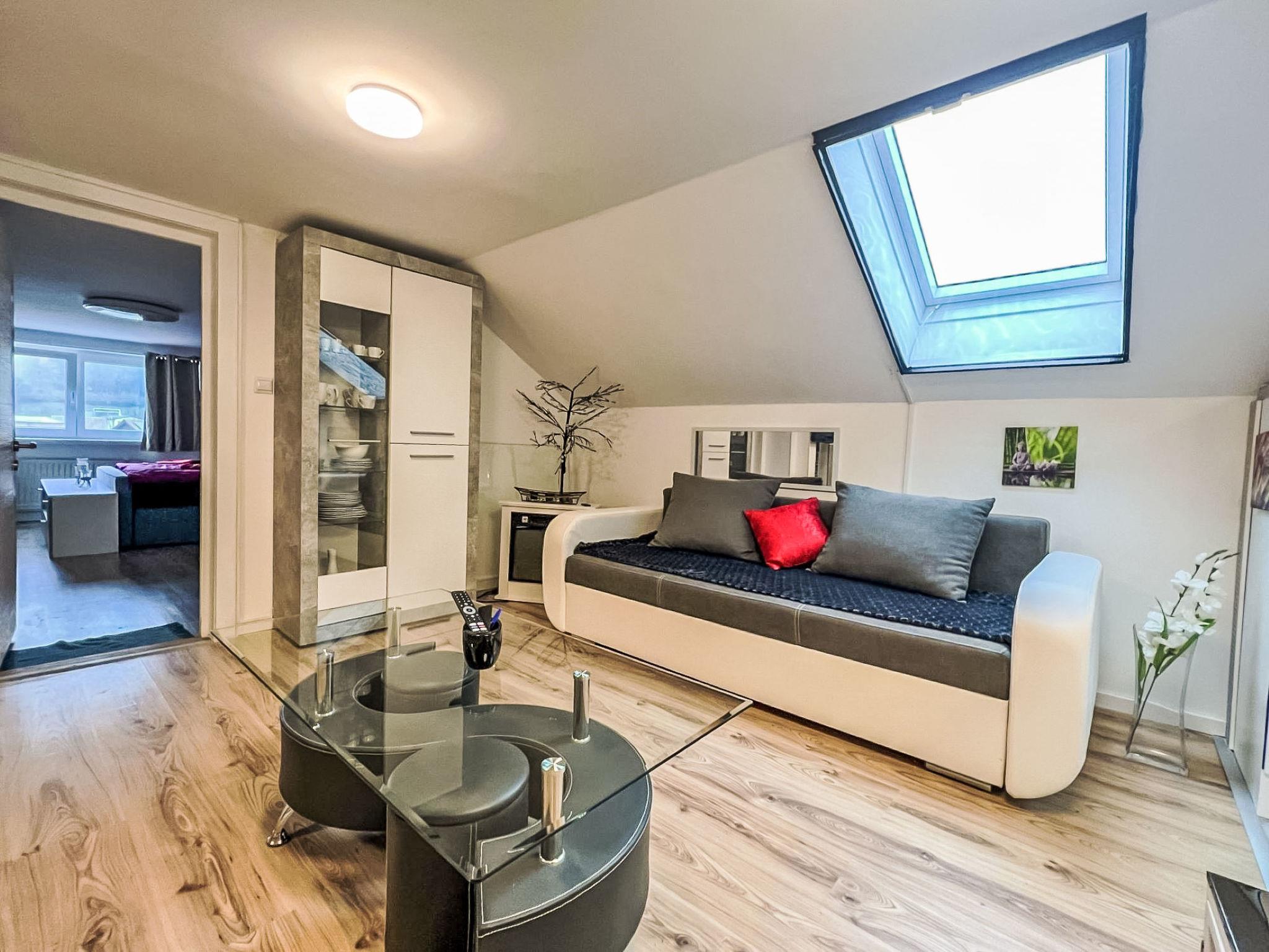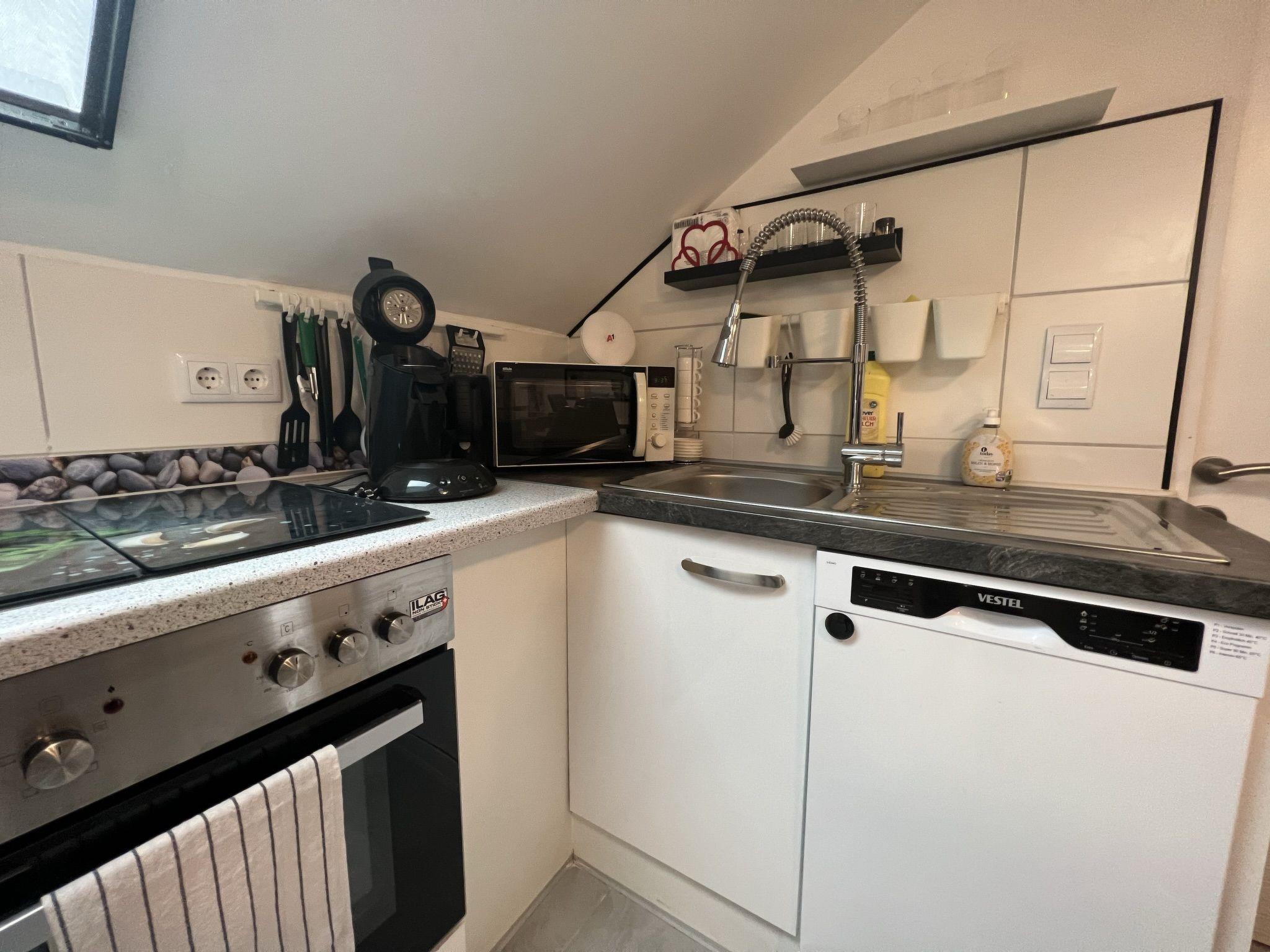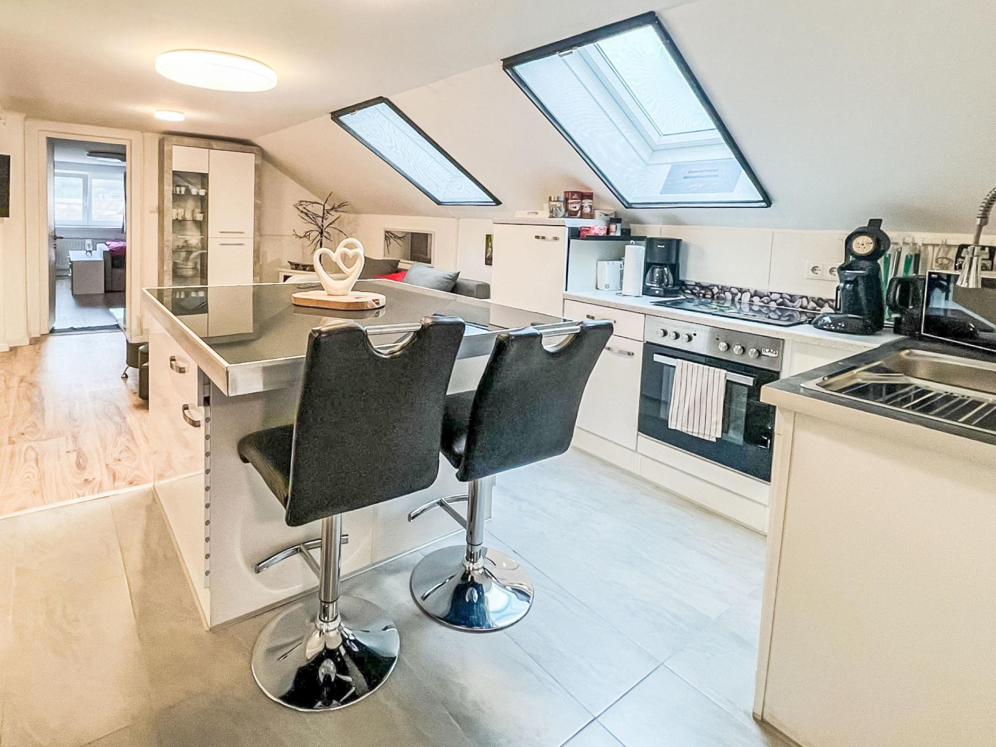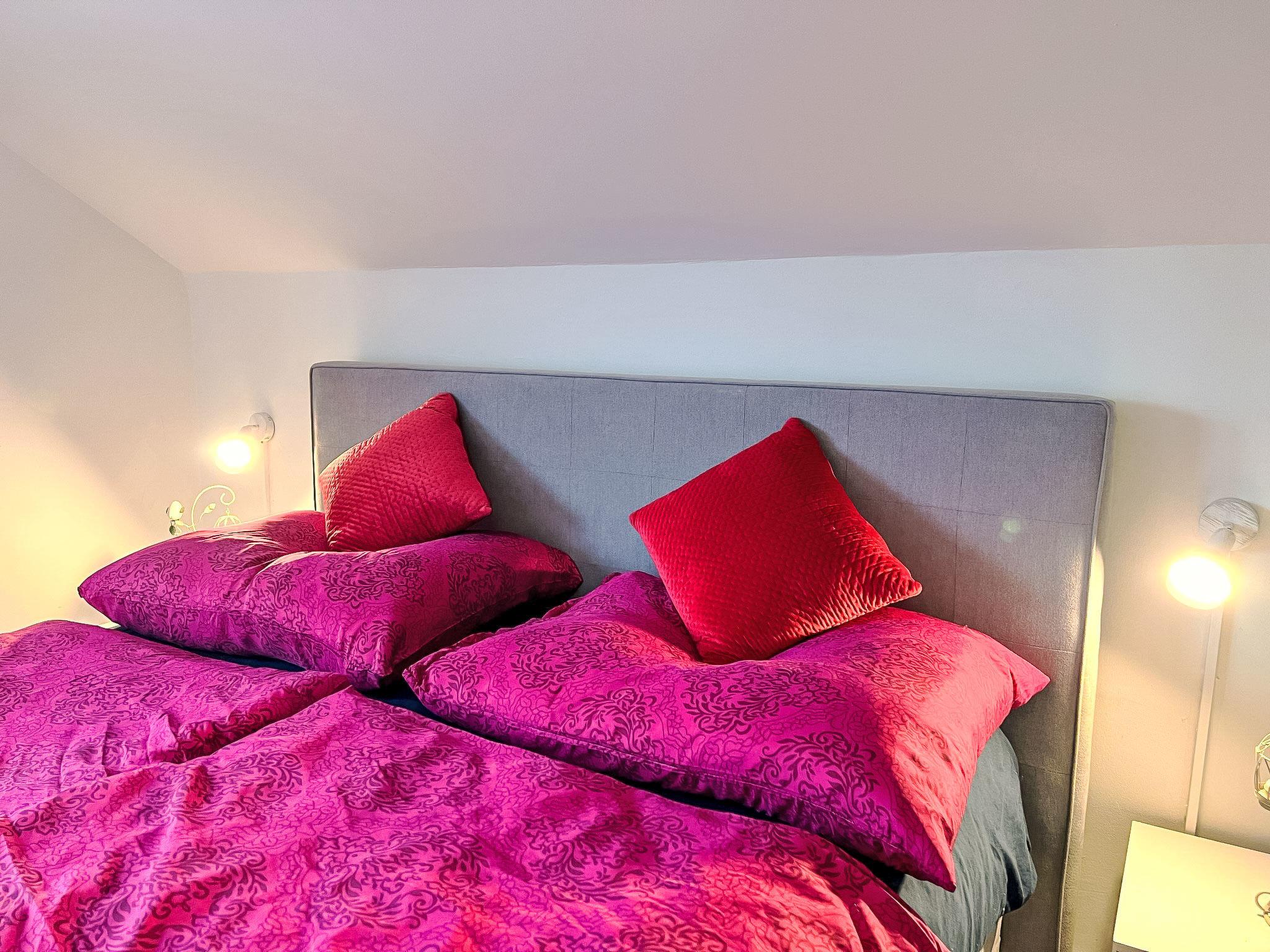 2-room apartment 70 m2 on 1st floor. Spacious and bright, partly with sloping ceilings, renovated in 2022, very comfortable and stylish furnishings: living/sleeping room with sloping ceilings with rooflight with 2 double sofabeds, TV and international TV channels (flat screen). 1 double bedroom with Dressing room. Open kitchen (4 hot plates, oven, dishwasher, kettle, microwave, electric coffee machine) with dining table and bar. Shower/WC. Electric heating. Parquet floors. Very beautiful view of the mountains. Facilities: washing machine, hair dryer. Internet (WiFi, free). Please note: non-smokers only. Maximum 2 pets/ dogs allowed.