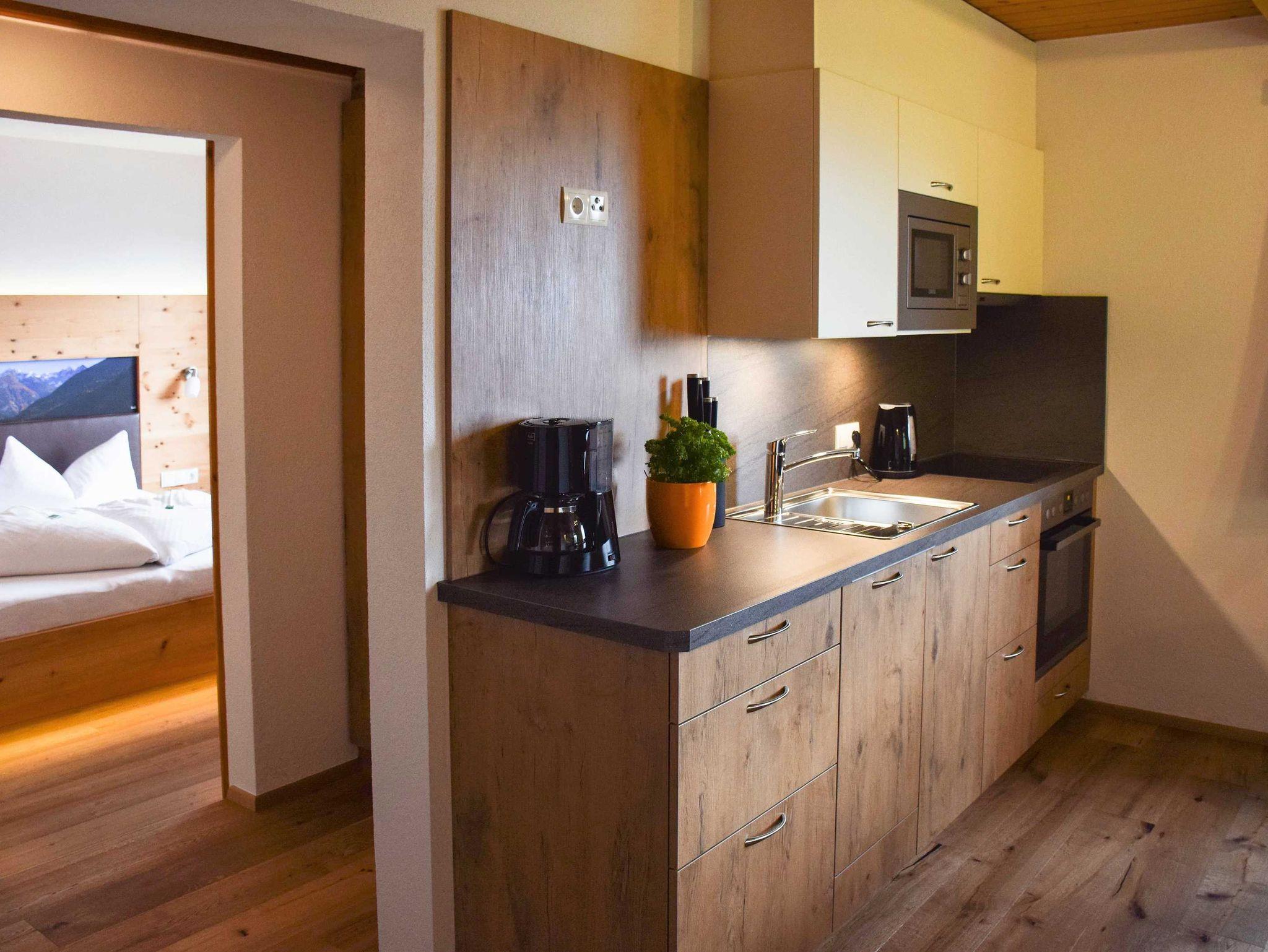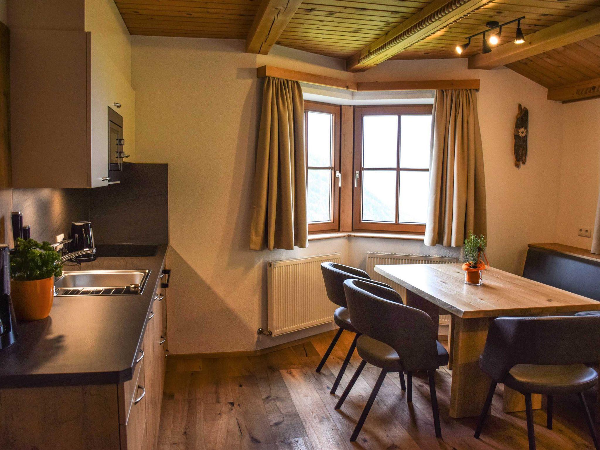 3-Raum-Fewo: großzügiges Apartment im modernen Tiroler Landhausstil mit herrlichem Ausblick und Südbalkon, voll ausgestattete Wohnküche mit Geschirrspüler, Backrohr, Mikrowelle; Couch, Sat-TV, Wifi, 2 Schlafzimmer und 2 Badezimmer; im 1. Stock über eine Treppe erreichbar