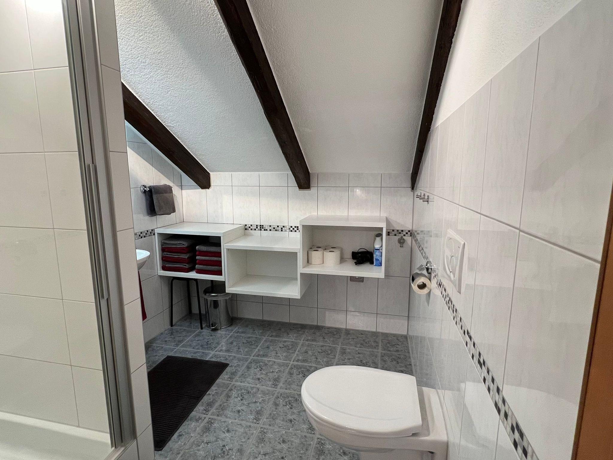 Das Badezimmer ist mit Dusche, Waschbecken und WC ausgestattet.