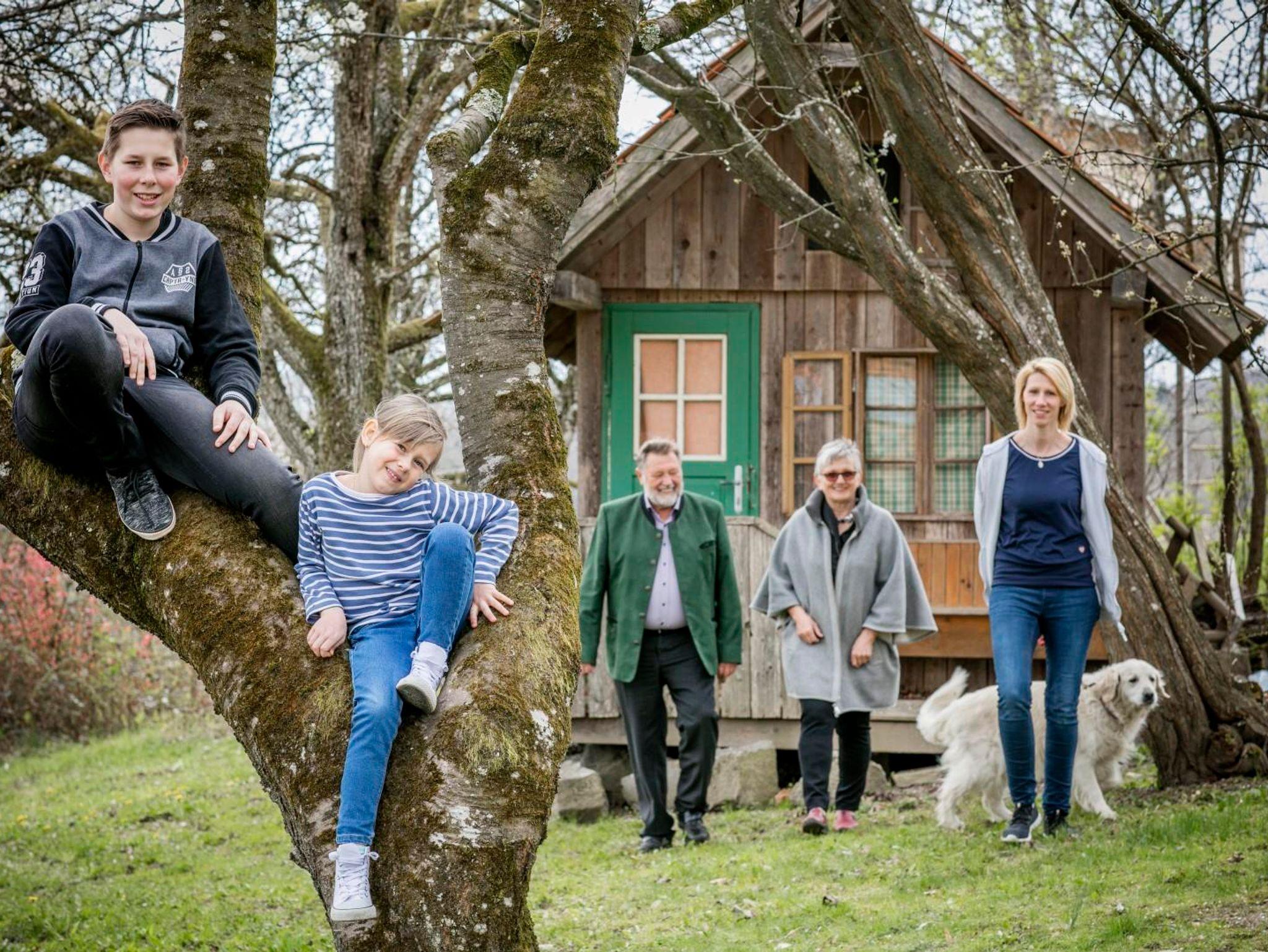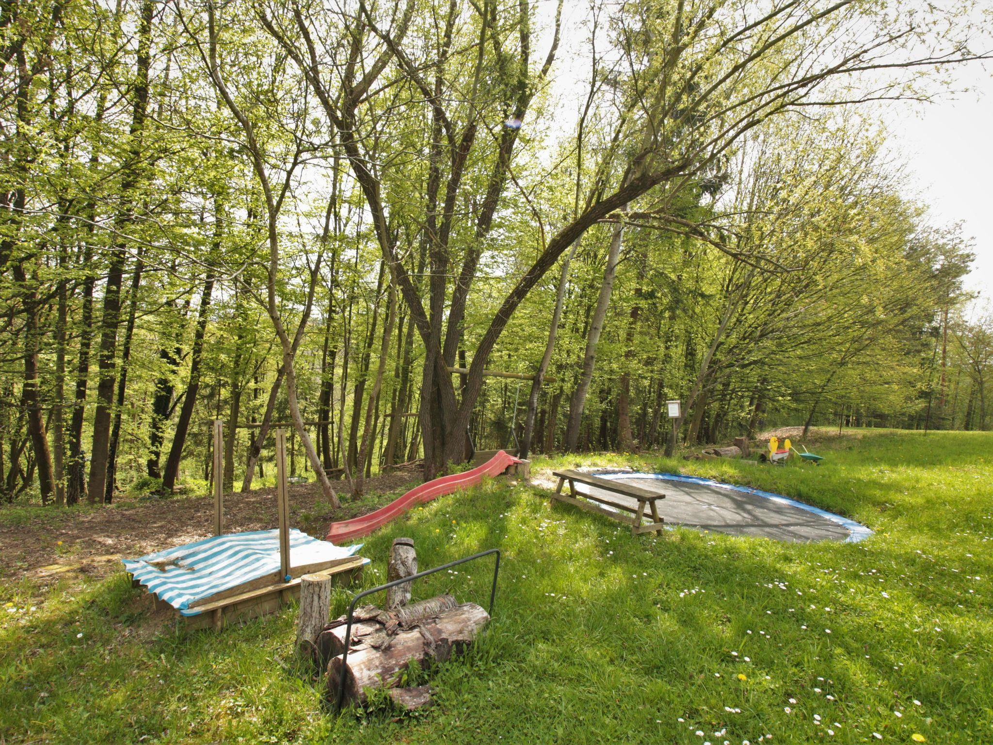 Der angrenzende kleine Wald bietet Entspannung pur beim Waldbaden. Am Waldesrand erfreuen sich Kinder am Trampolin, beim Sandspielen und Schaukeln.